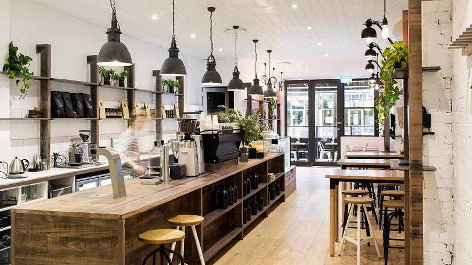 Phong cách công nghiệp sử dụng các chất liệu thô mộc của các quán cafe được rất nhiều bạn trẻ yêu thích. Sự giản dị, gọn gàng cùng các chi tiết đèn và các kệ lớn trưng bày sản phẩm, vật dụng pha chế của quán thu hút các khách hàng yêu thích không gian quán cafe yên tĩnh, nhẹ nhàng. Chất liệu gỗ vẫn được vận dụng tối ưu tạo nên cảm giác ấm cúng, gần gũi. Những chiếc ghế tròn nhỏ gọn tạo cảm giác quán không bị giới hạn bởi không gian nhỏ hẹp. Quán bố trí một dãy bàn dọc lối đi và một chiếc bàn lớn ngay khu vực pha chế dành cho các khách hàng muốn trò chuyện cùng nhân viên của quán.