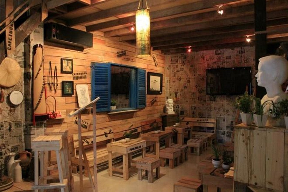 Quán tối ưu không gian bằng cách sử dụng những bộ bàn ghế nhỏ bằng gỗ giống phong cách của những quán cóc truyền thống. Các mảng tường xung quanh được trang trí bằng những món đồ nhỏ xinh. Trong không gian quán cafe đơn giản, ấm cúng này cùng với một chút âm nhạc acoustic nhẹ nhàng, lắng đọng sẽ khiến cho những buổi gặp gỡ, trò chuyện thêm phần cảm xúc.