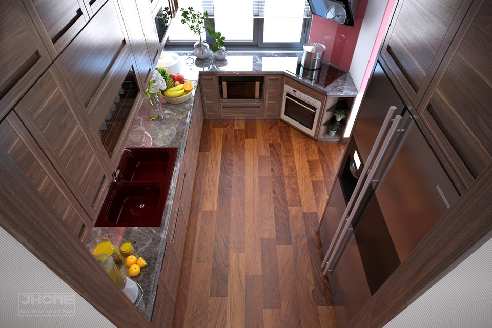 Thiết kế nội thất chung cư 72m2 nên bố trí vị trí bếp hợp lý, tận dụng tối đa diện tích nhưng phải chú ý mặt phong thủy. Căn bếp chung cư với không gian hiện đại nên sử dụng các tông màu sáng, với nhiều ngăn chứa đồ giúp người nội trợ dễ dàng sắp xếp, phân chia đồ dùng trong bếp.
