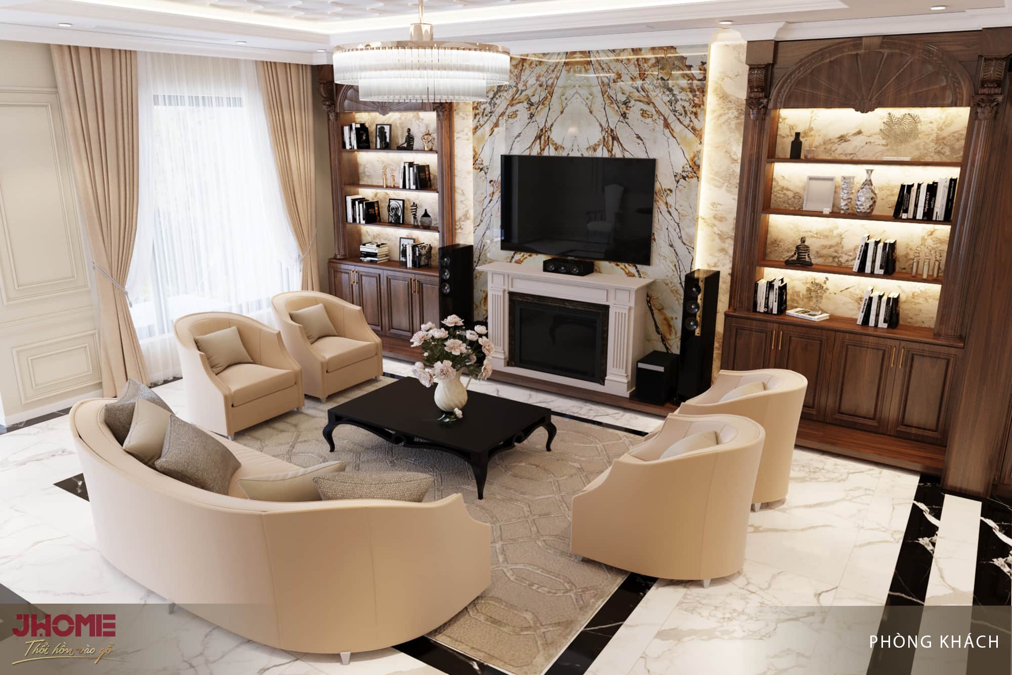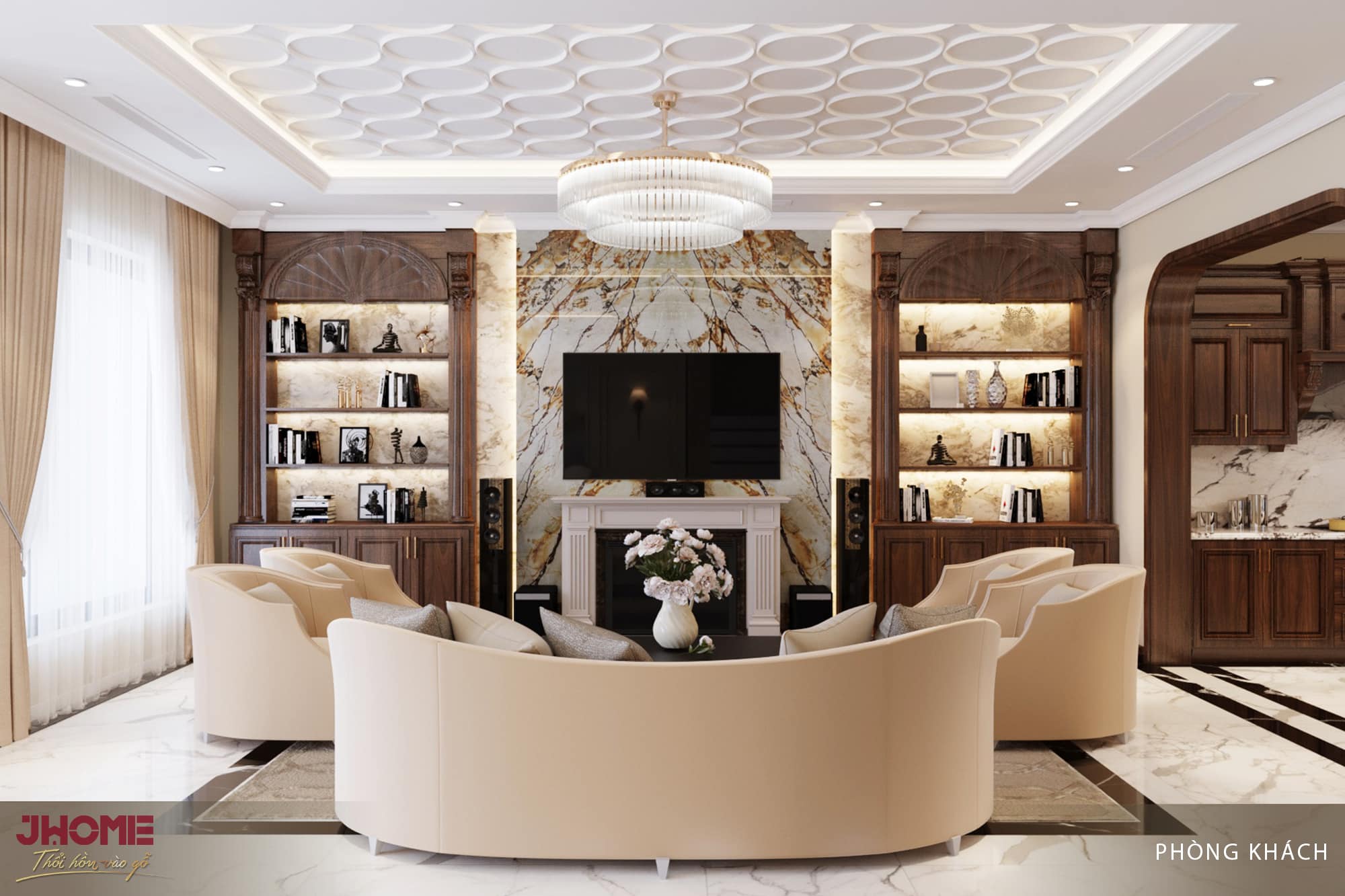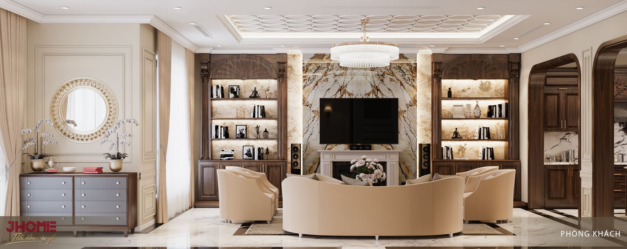 Nội thất phòng khách sang trọngTủ trang trí Gỗ óc chó kịch trần được đặt xung quanh kệ tiviTủ để đồ Gỗ óc chó nằm cạnh cửa ra vào