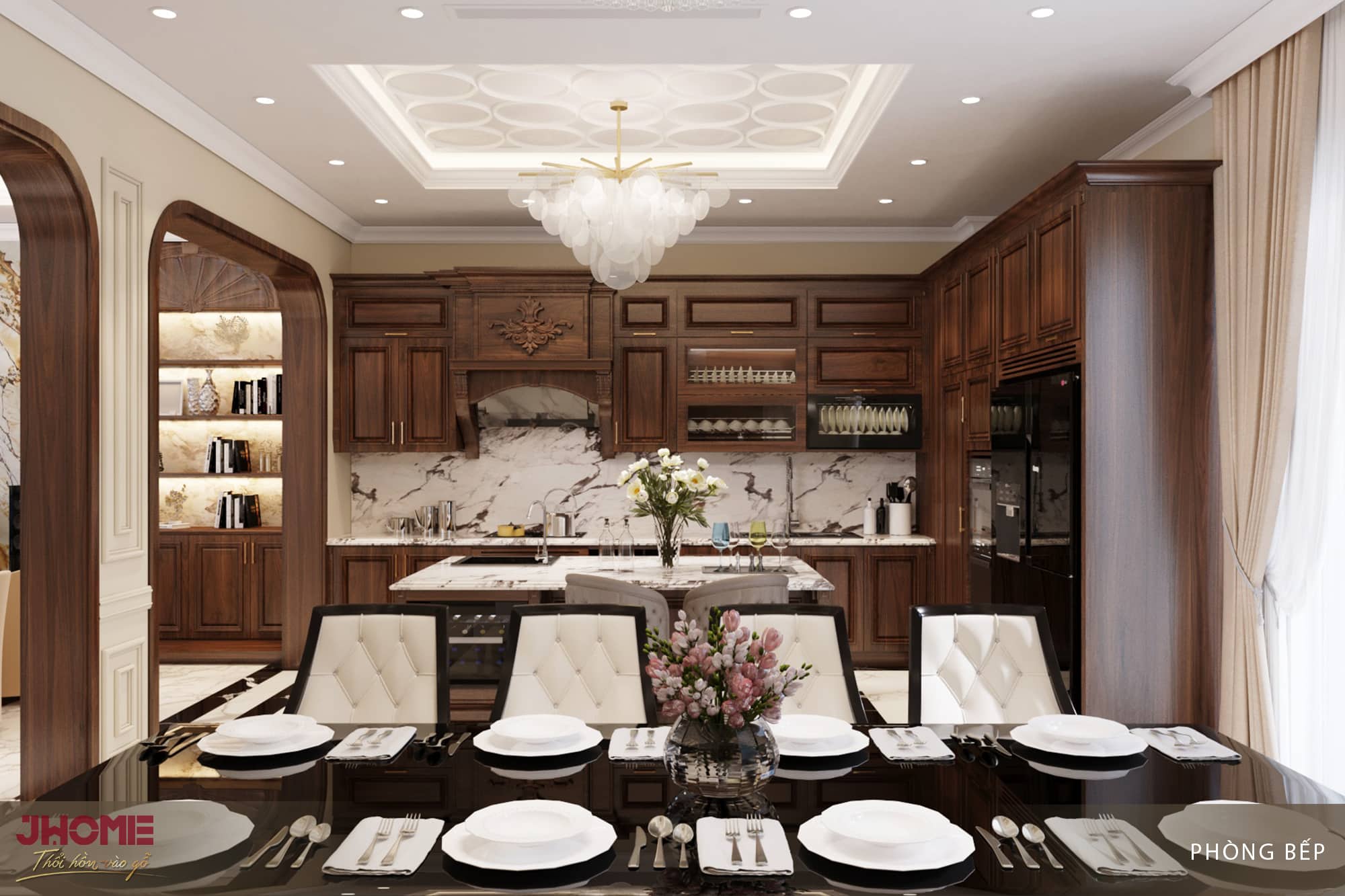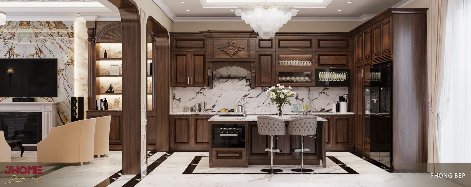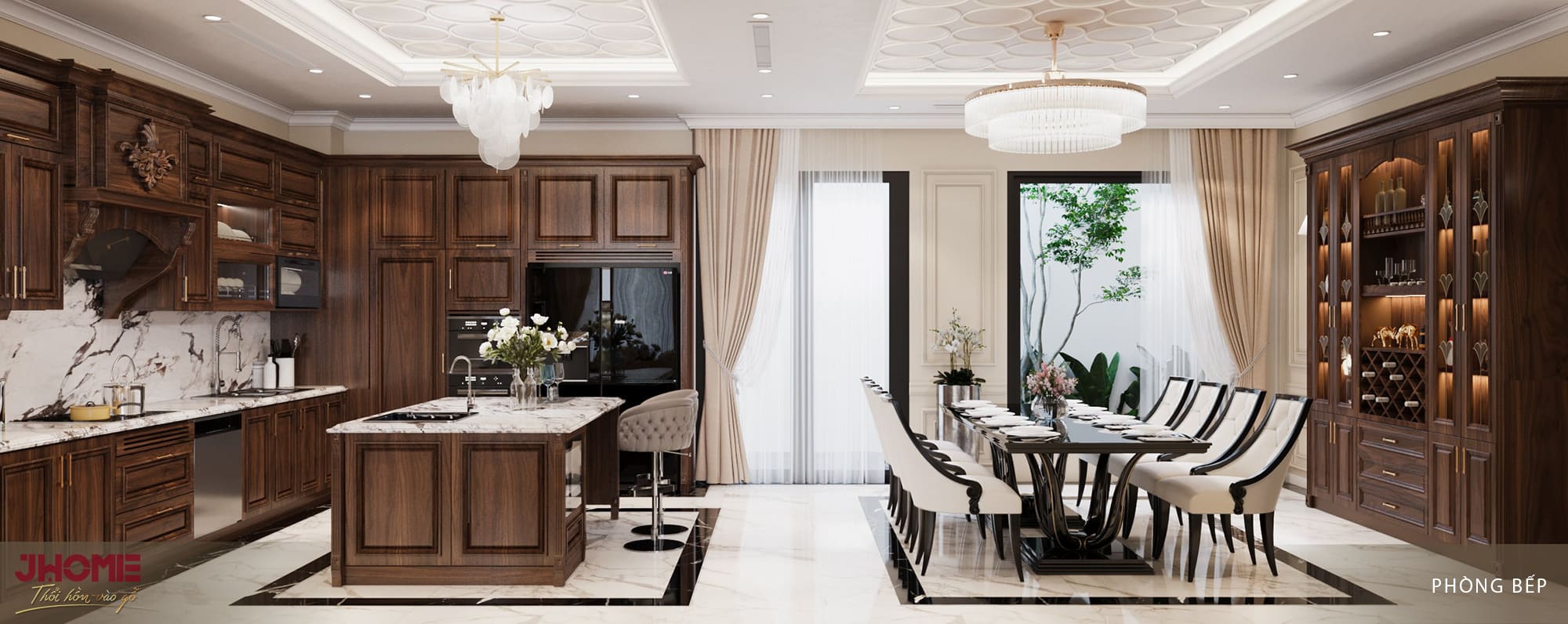 Toàn bộ căn phòng sử dụng Gỗ óc chó nhập khẩu Bắc Mỹ, tạo nên sự sang trọng và đồng nhấtKhông gian phòng bếp và phòng khách được nối liền với nhau, giữa là những cột ốp Gỗ óc chó tự nhiênBộ bàn ăn được thiết kế theo phong cách Châu Âu đương đại