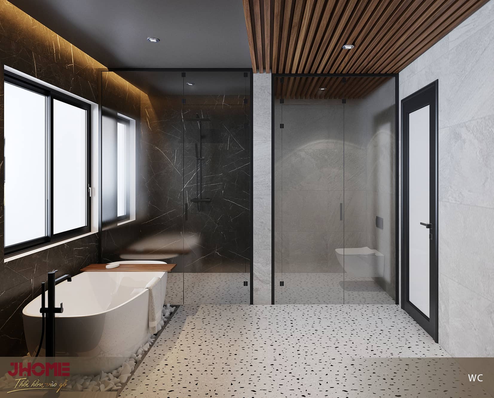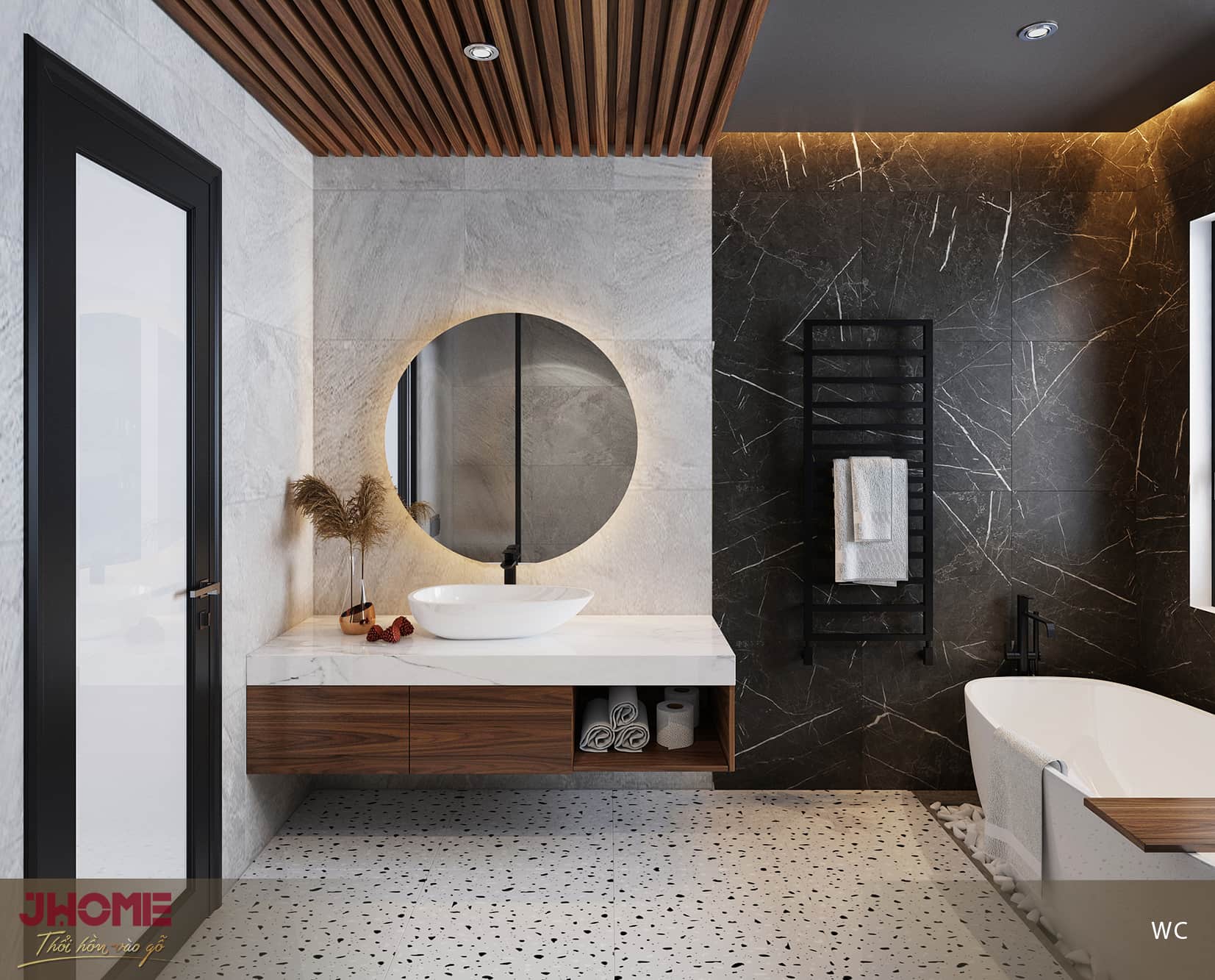 Phòng vệ sinh với trần được ốp gỗTủ đỡ bồn rửa tay Gỗ óc chó tự nhiên