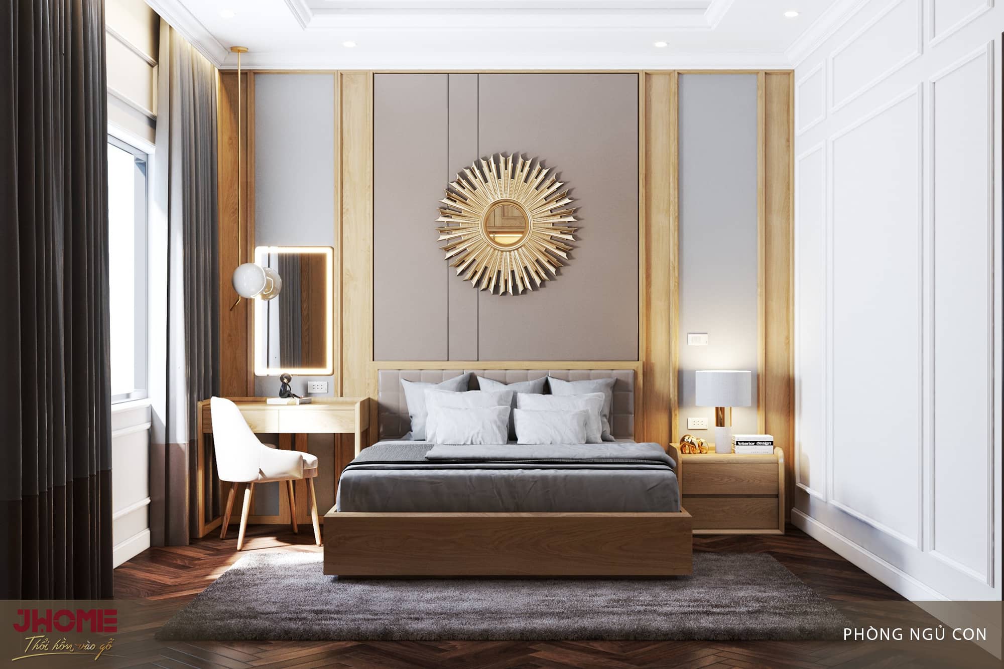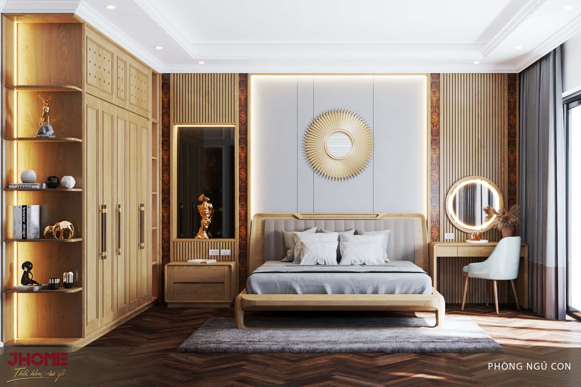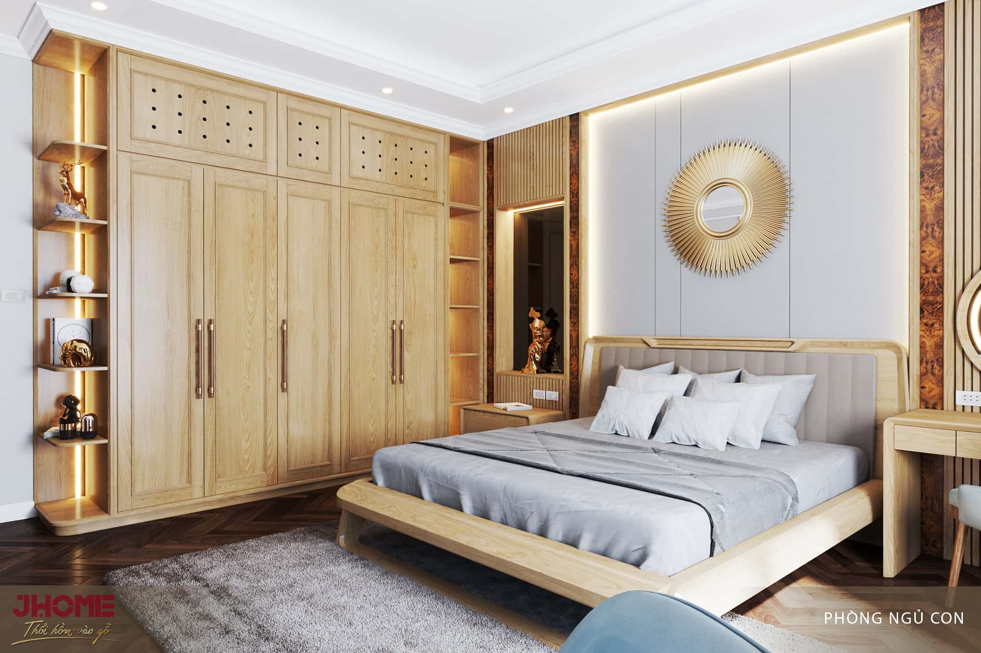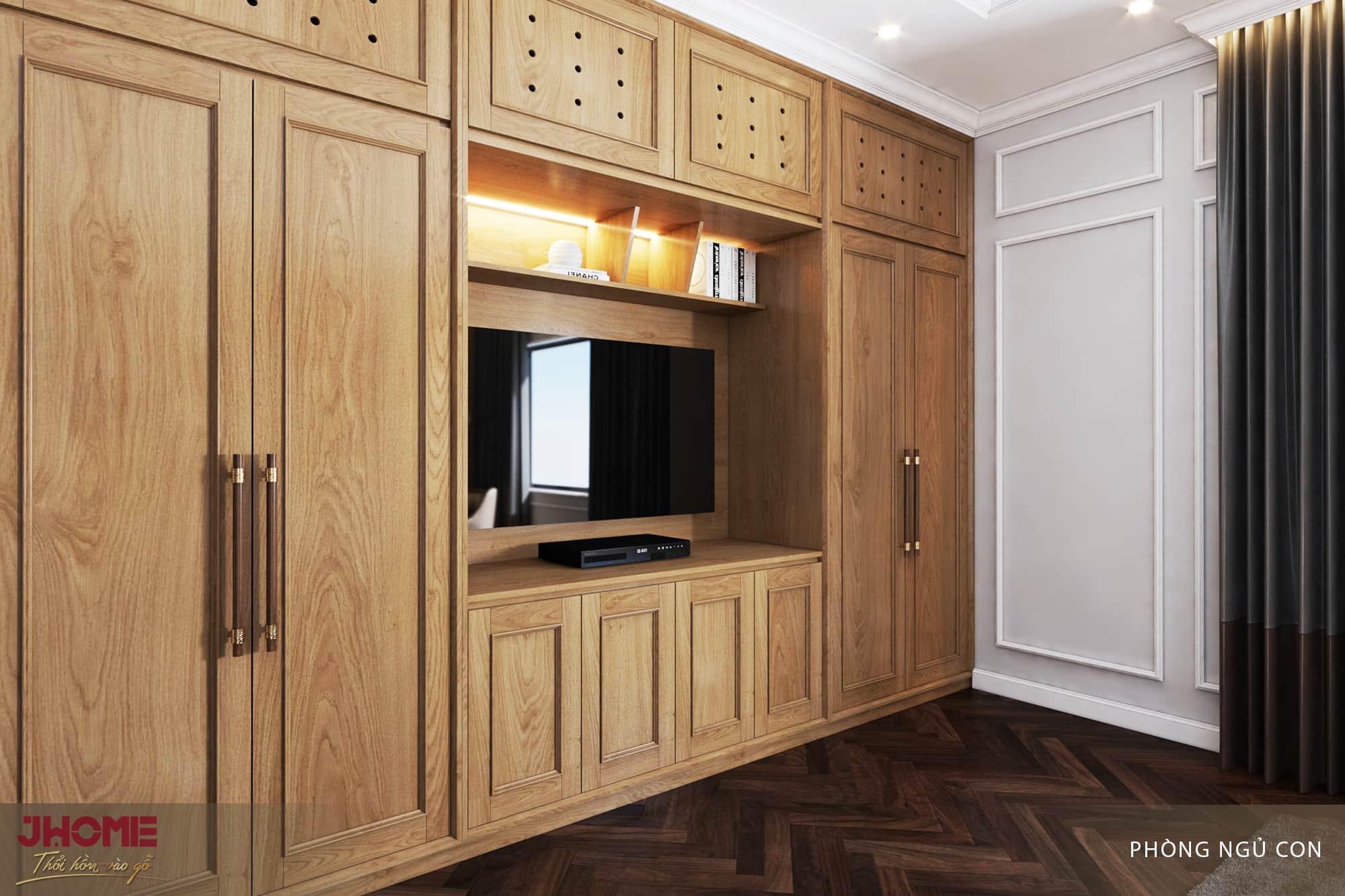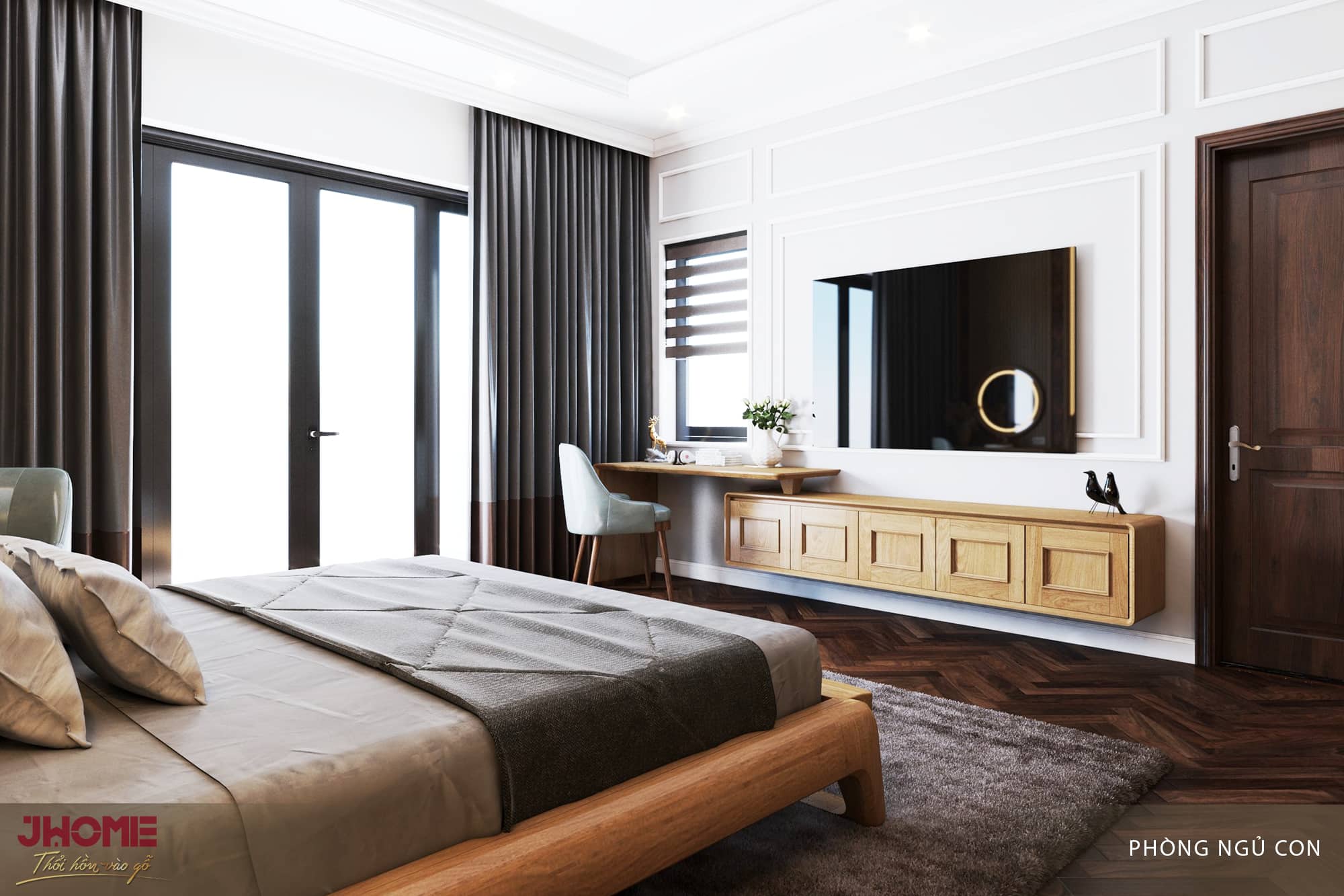 Phòng ngủ con lớn sử dụng Gỗ Sồi tự nhiên nhập khẩu cao cấpVới bàn làm việc và kệ tivi được nối liền với nhauTủ quần áo Gỗ Sồi được gắn thêm các kệ trang trí dễ thương
