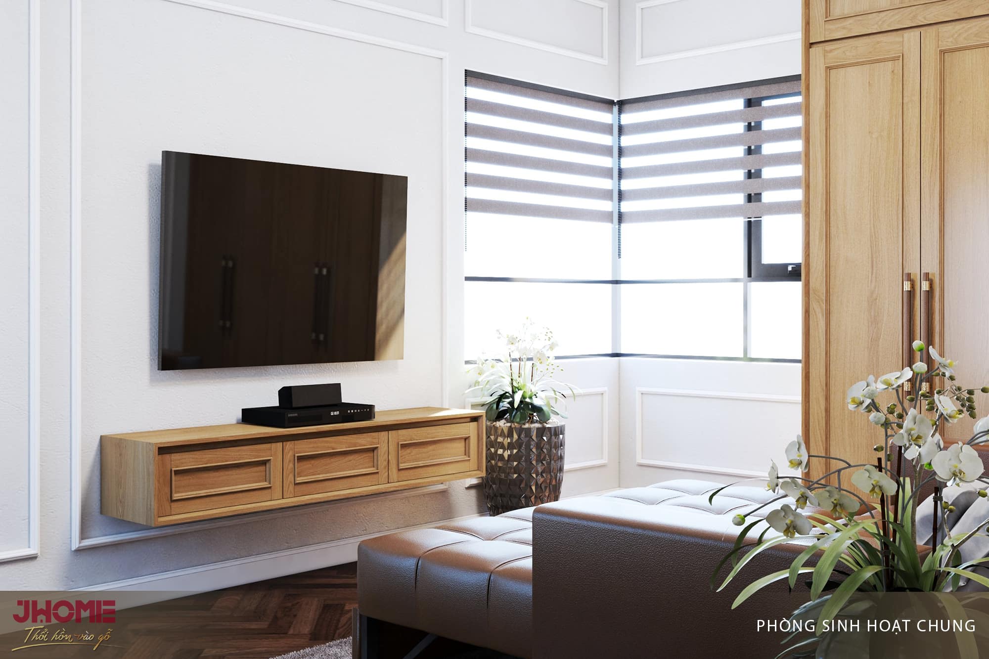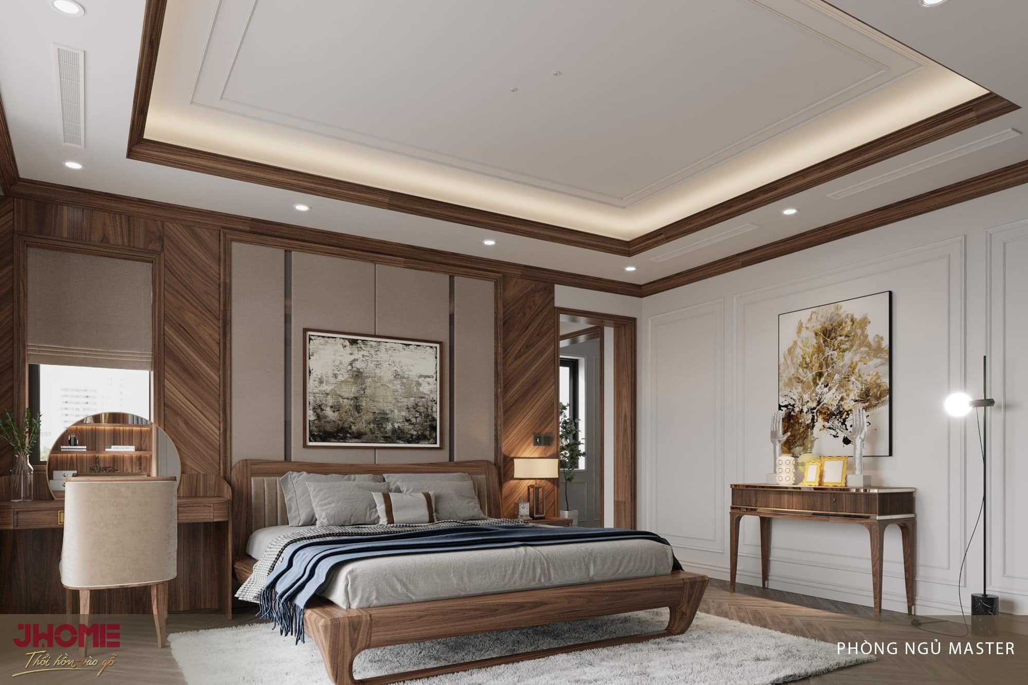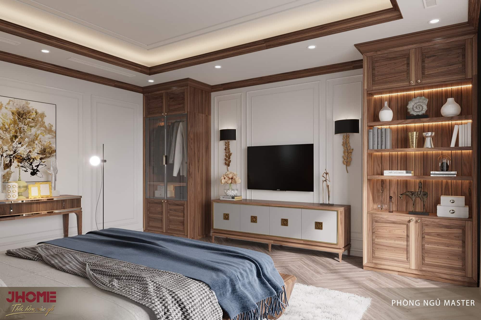 Nội thất phòng ngủ sử dụng Gỗ óc chó tự nhiên Bắc MỹBên cạnh kệ tivi là tủ trang trí và tủ quần áo miniTrần nhà thạch cao được ốp viền gỗ tinh tế
