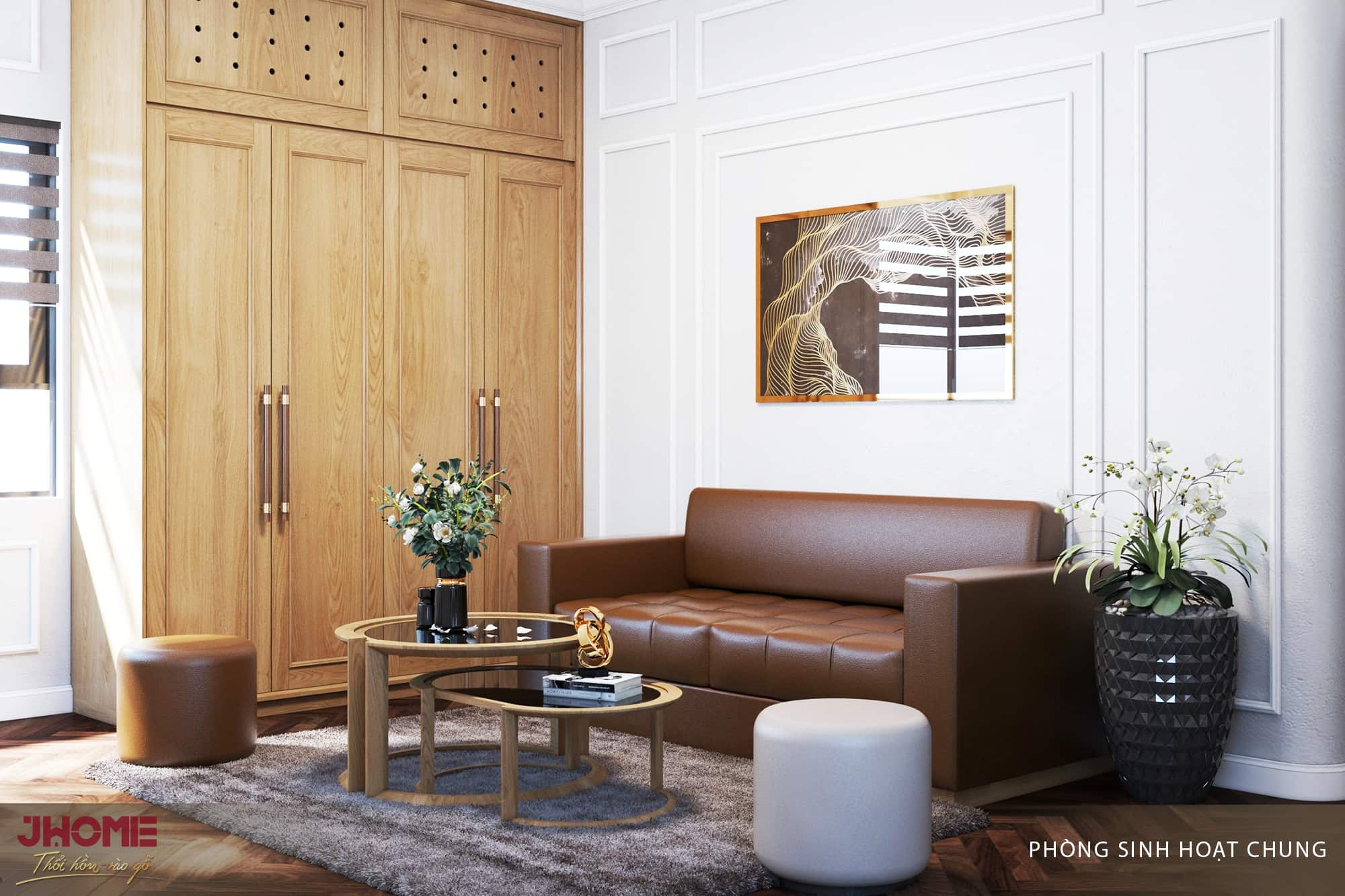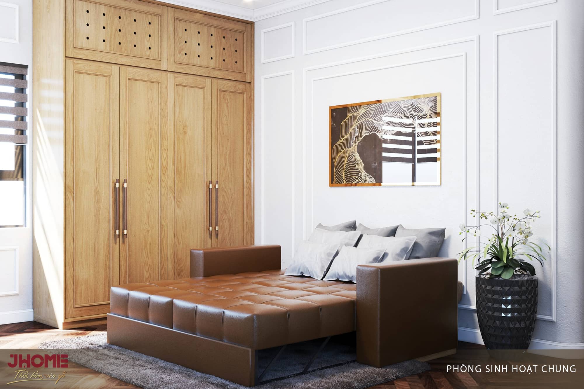 Phòng sinh hoạt chung được trang bị tủ gỗ và ghế sofa bọc da sang trọngVới thiết kế có thể ngả ra thành giường tiện lợi