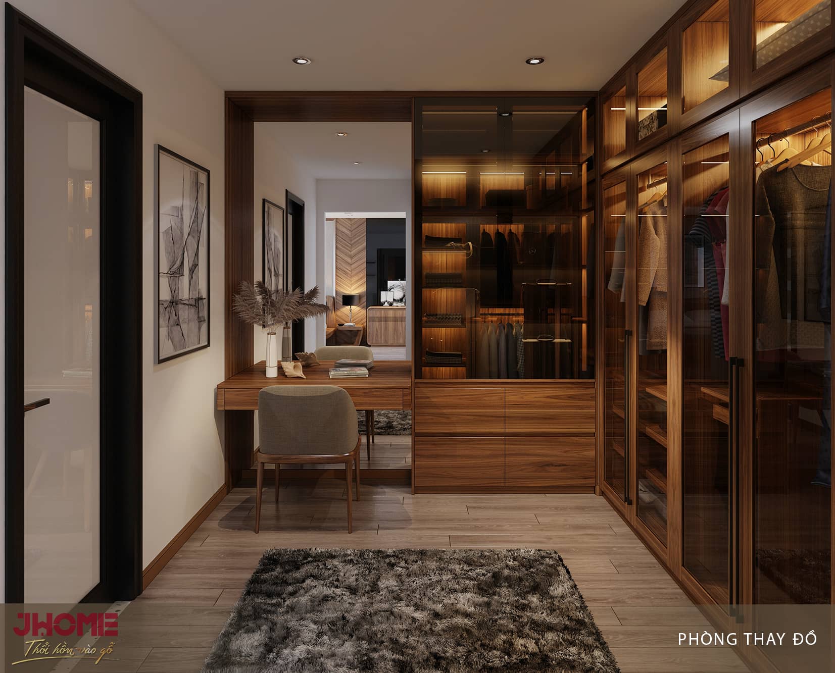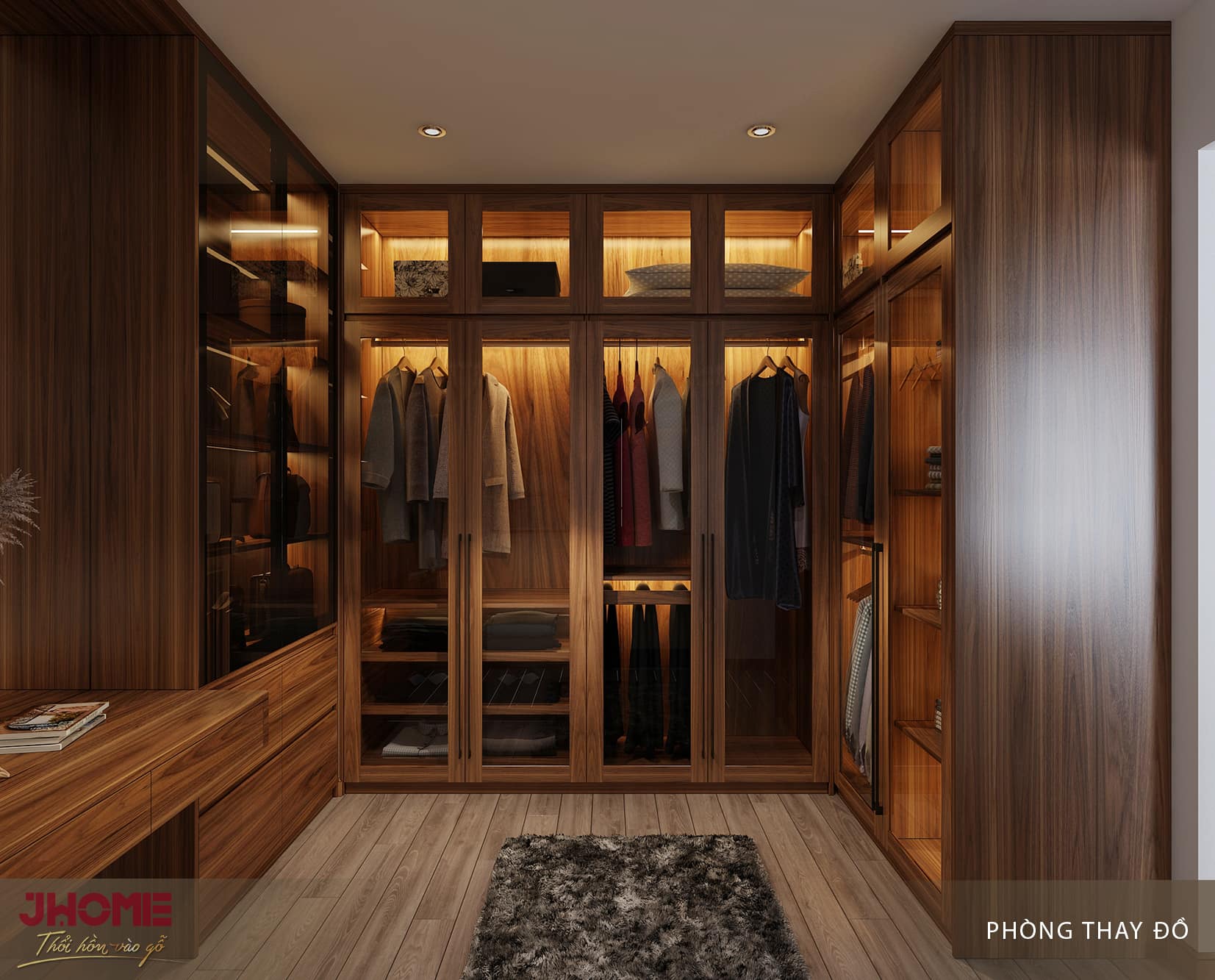 Phòng thay đồ sử dụng Gỗ óc chó tự nhiên nhập khẩu cao cấpVới thiết kế cửa ốp kính trong suốt tinh tế