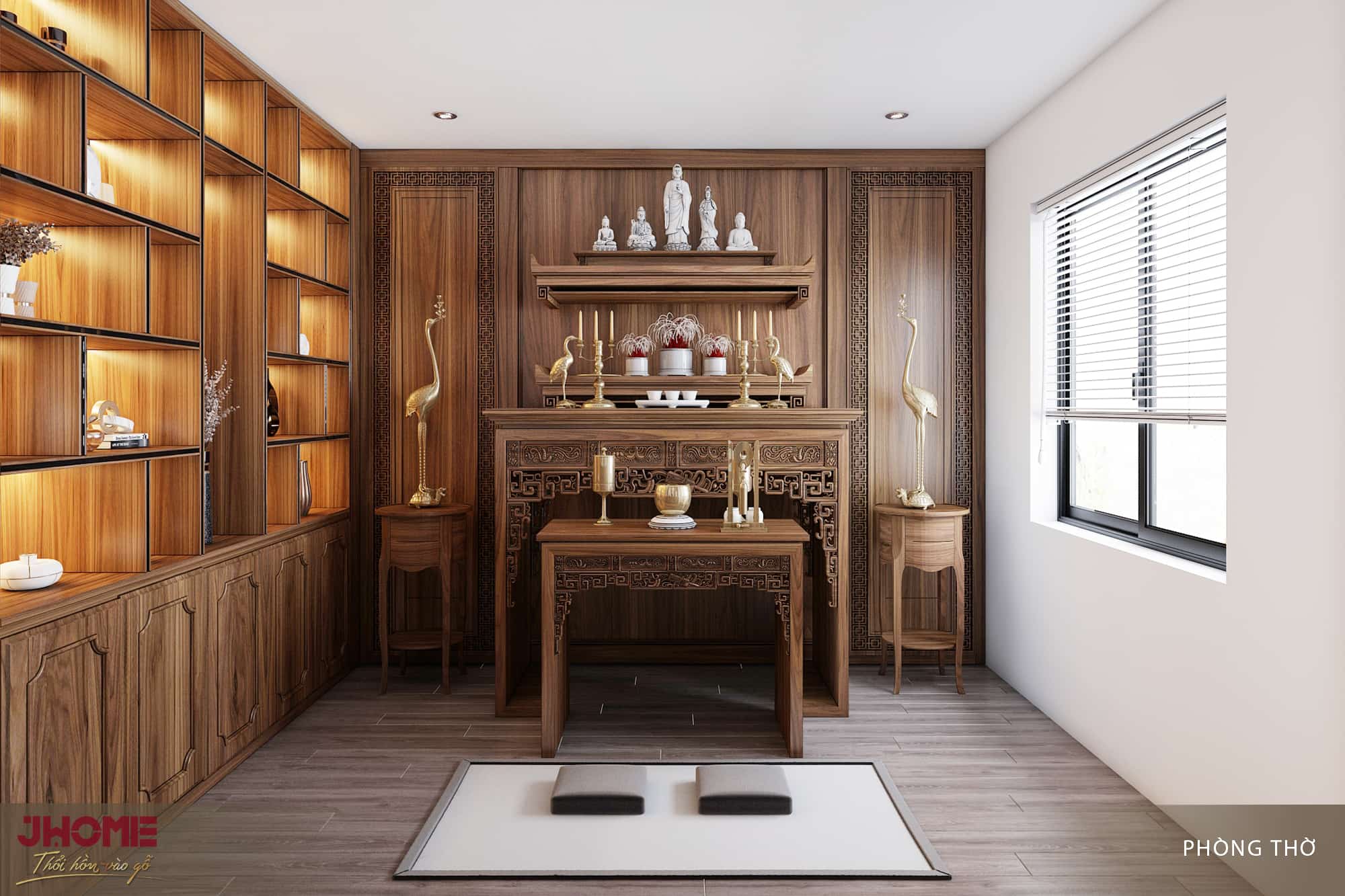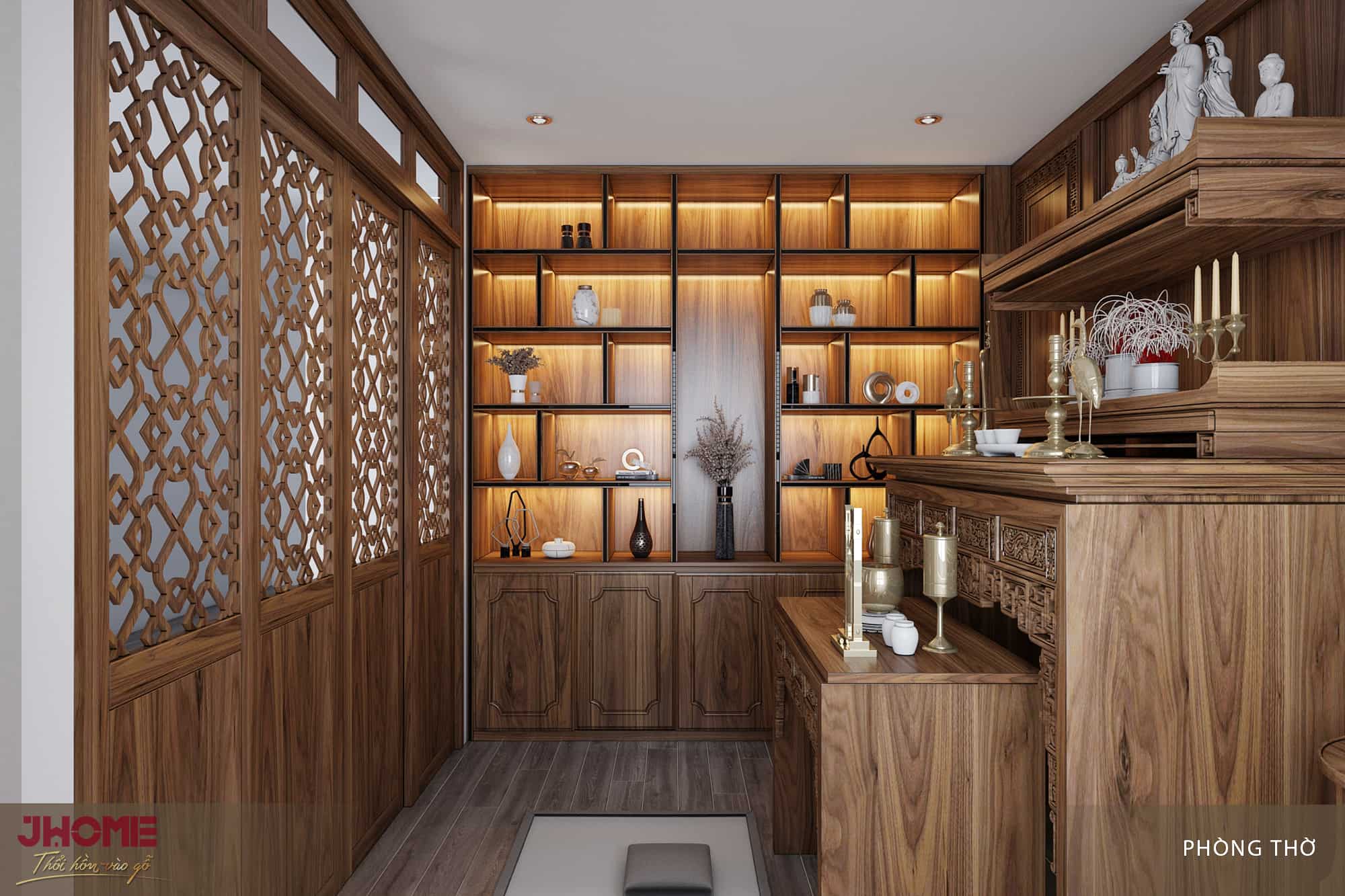 Phòng thờ sử dụng Gỗ óc chó tự nhiên Bắc Mỹ sang trọng, cổ kínhVới thiết kế theo tầng trang nghiêm
