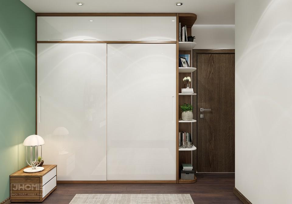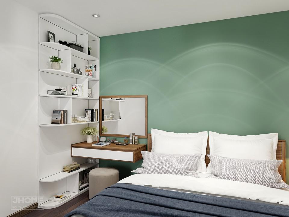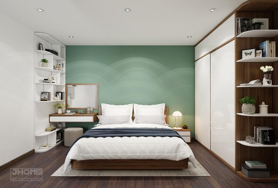 Phòng ngủ master cũng được thiết kế hiện đại với tông màu xanh là nổi bật ở tườngTủ quần áo phòng ngủ thiết kế kịch trần với cánh trượt giúp tiết kiệm diện tíchKhu vực bàn trang điểm và tủ trang trí màu trắng có thiết kế ấn tượng