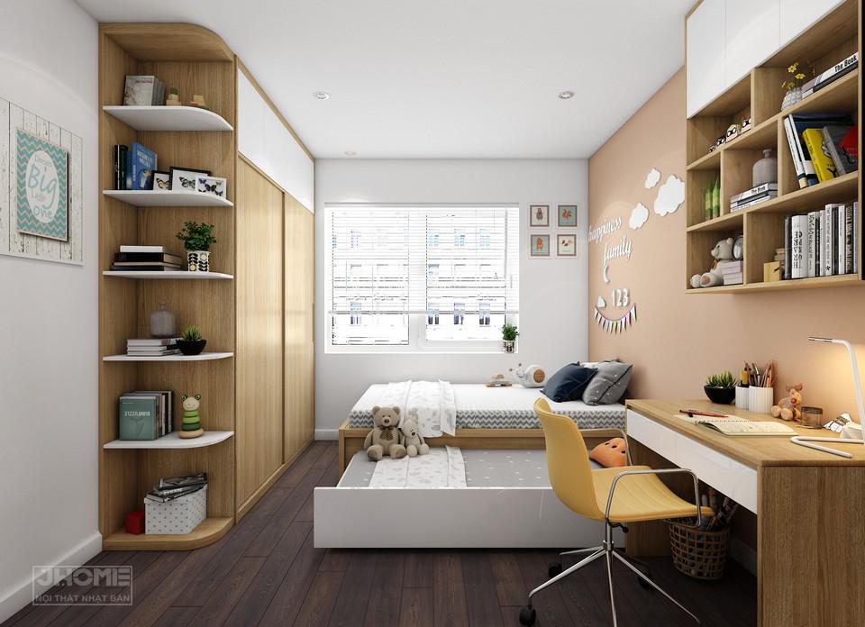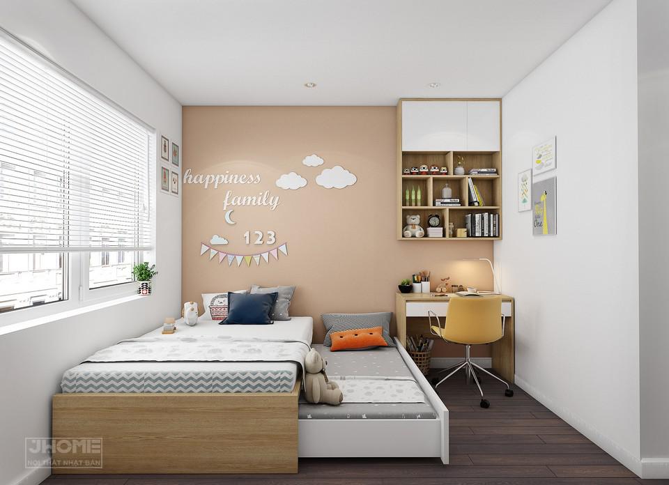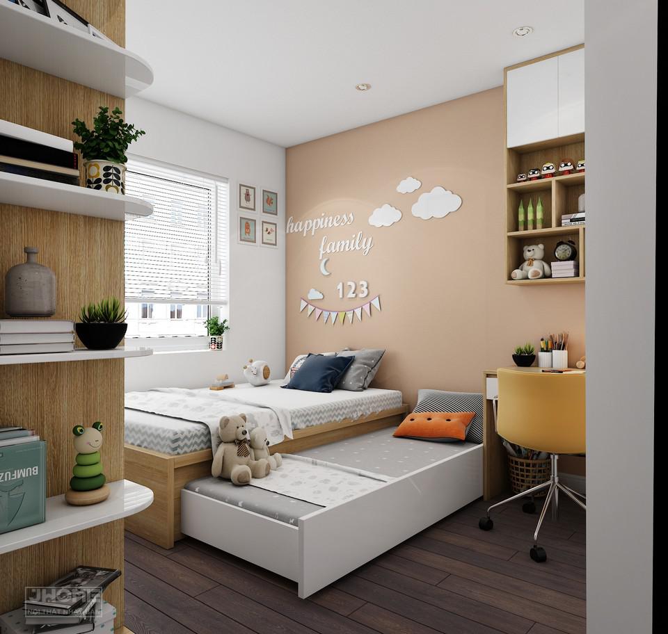 Phòng ngủ con được trang trí với mảng tường màu cam nhạt và các hình ảnh trang trí đẹp mắtGiường ngủ gỗ sồi thông minh có ngăn kéo tạo ra một chỗ ngủ nữa giúp tiết kiệm không gianBàn học và tủ quần áo hiện đại với thiết kế trẻ trung, tiện dụng