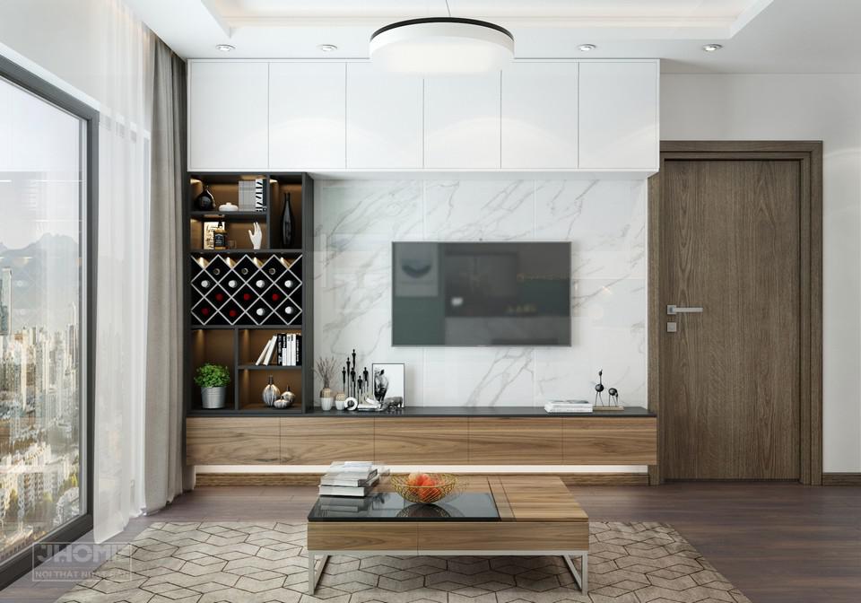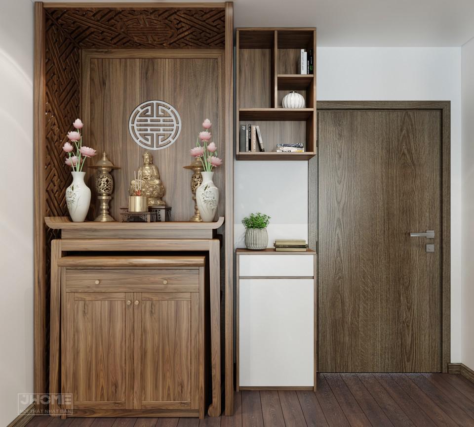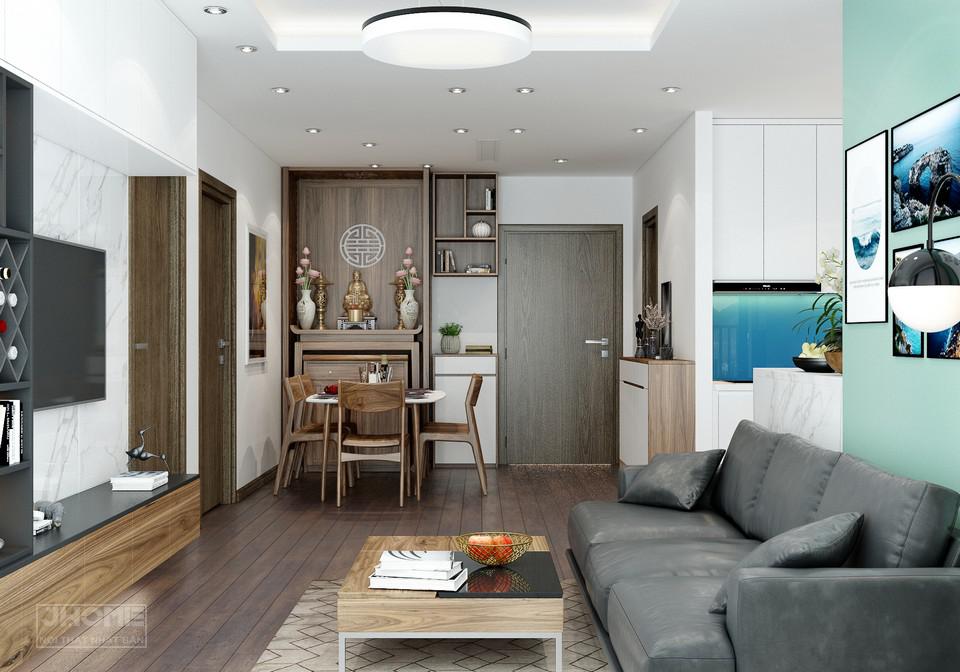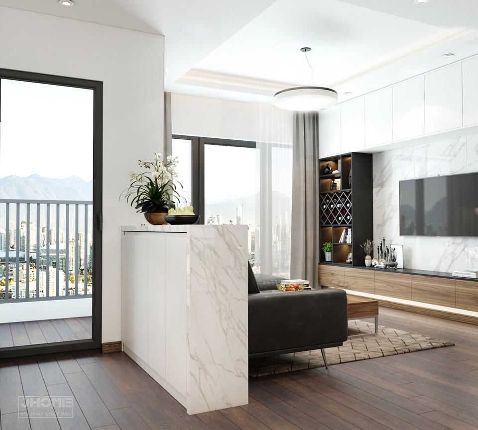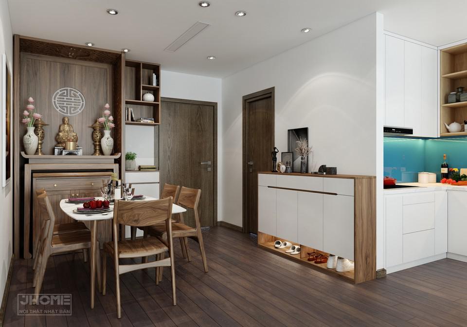 Thiết kế nội thất phòng khách với bộ sofa văng da màu đen, bàn trà hiện đạiTường phòng khách trang trí bằng màu nâu, tủ bếp chữ L hiện đại với cánh trắng thanh lịchTủ kệ tivi thiết kế hiện đại vân mây có kèm tủ rượu và trang trí bên cạnhPhòng ăn, phòng thờ và phòng khách liên thông nhauTủ giầy nhỏ được thiết kế hiện đại với cánh trắngKhu vực thờ cúng nhỏ có chiếc bàn thờ đứng phong cách hiện đại và bên cạnh là chiếc tủ nhỏ cao kịch trầnSau sofa là chiếc tủ liền vách ngăn thú vị thông ra ban côngBàn ăn nhỏ cho 5 người chất liệu gỗ sồi veneer óc chó với mặt bàn bằng đá hiện đại