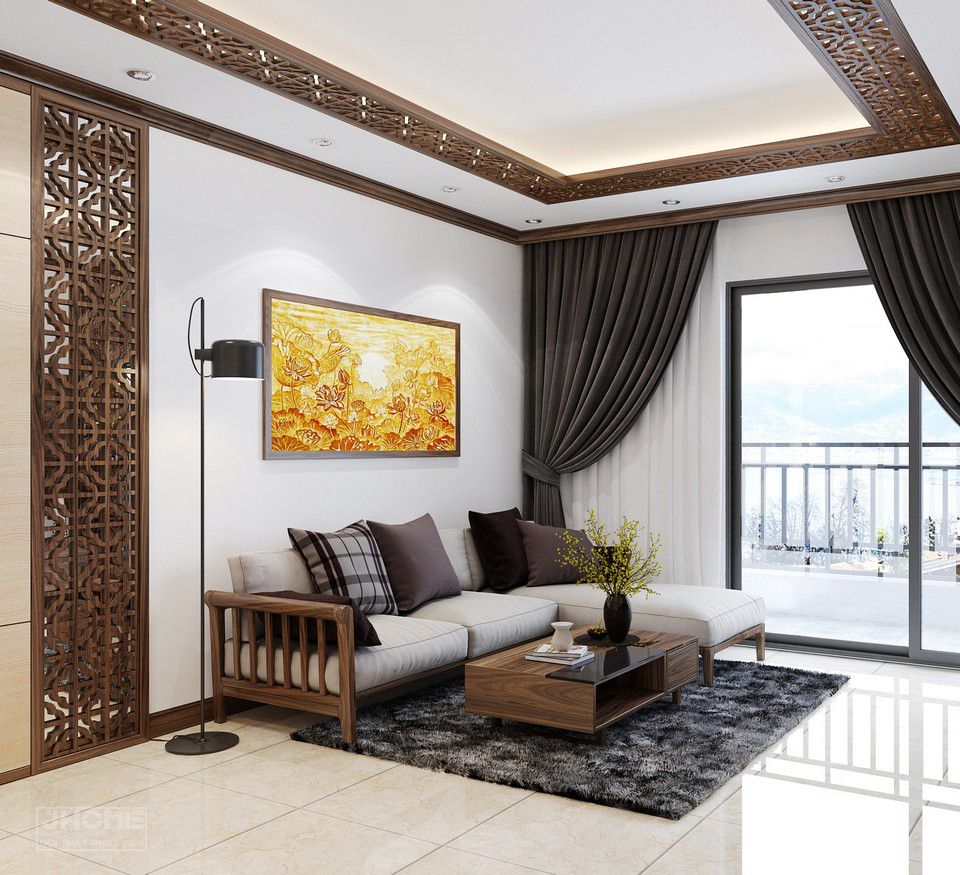Bộ sofa phòng khách chữ L được thiết kế phong cách Á Đông chất liệu gỗ óc chó