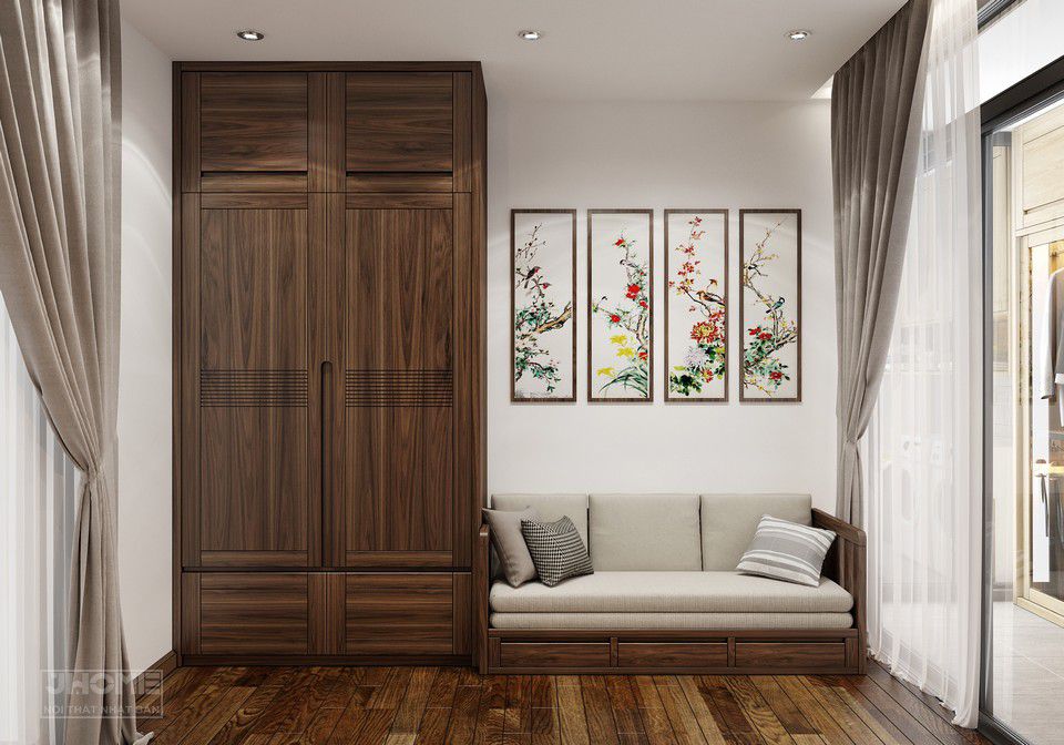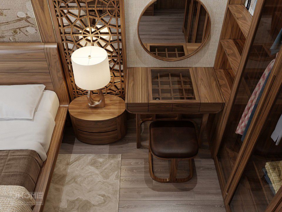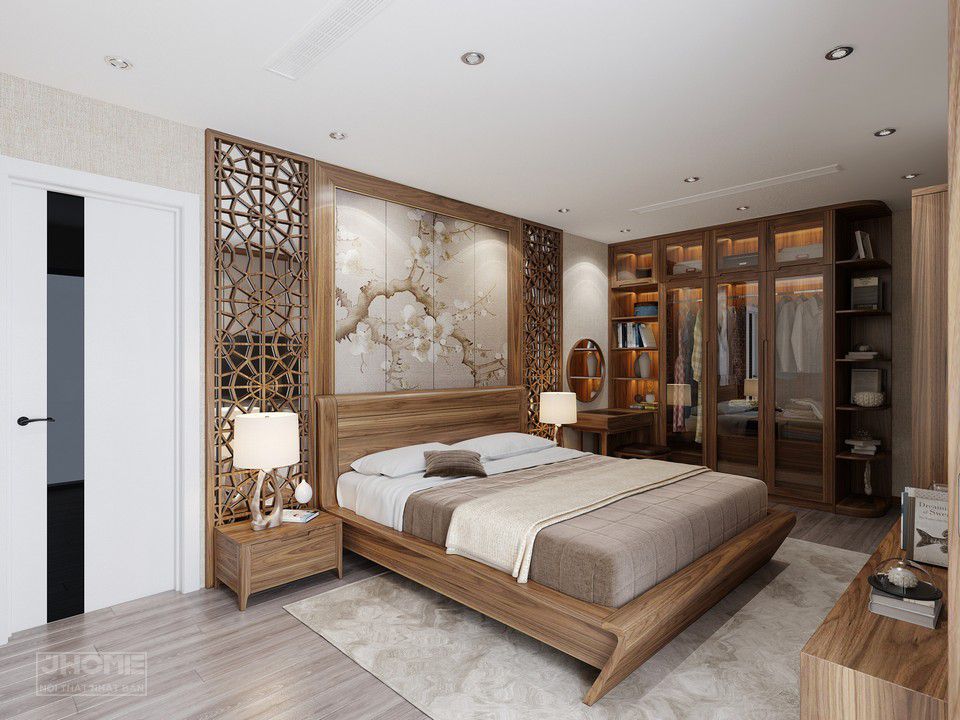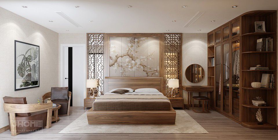 Thiết kế nội thất phòng ngủ phong cách Á Đông gỗ óc chó