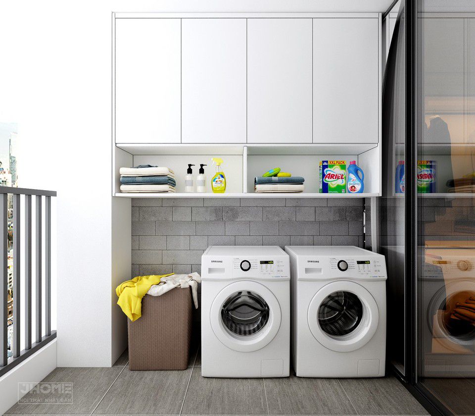 Thiết kế ban công/chỗ phơi đồ với hệ tủ màu trắng thanh lịch