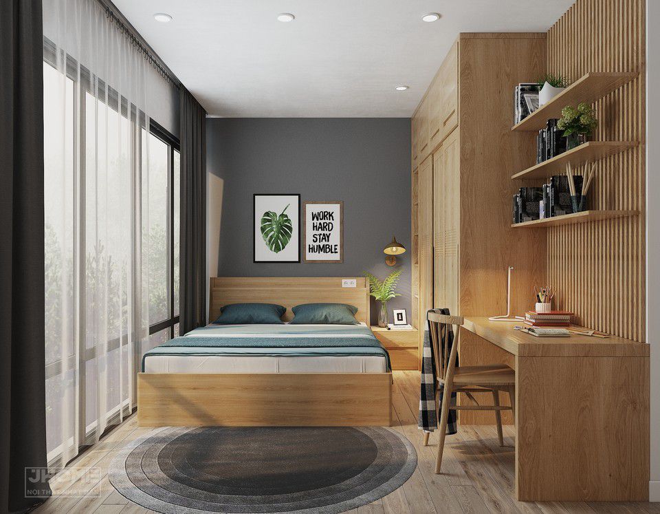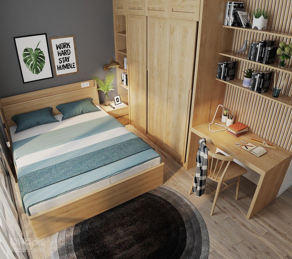 Tủ quần áo có thiết kế kịch trần bố trí cạnh bàn học