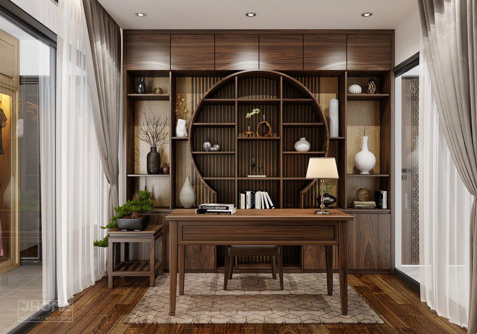 Hệ giá sách phòng làm việc được thiết kế phong cách Á Đông với nhiều ngăn ấn tượng