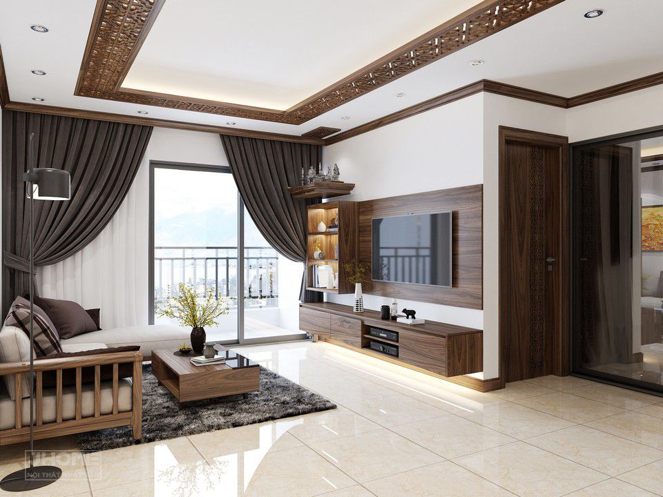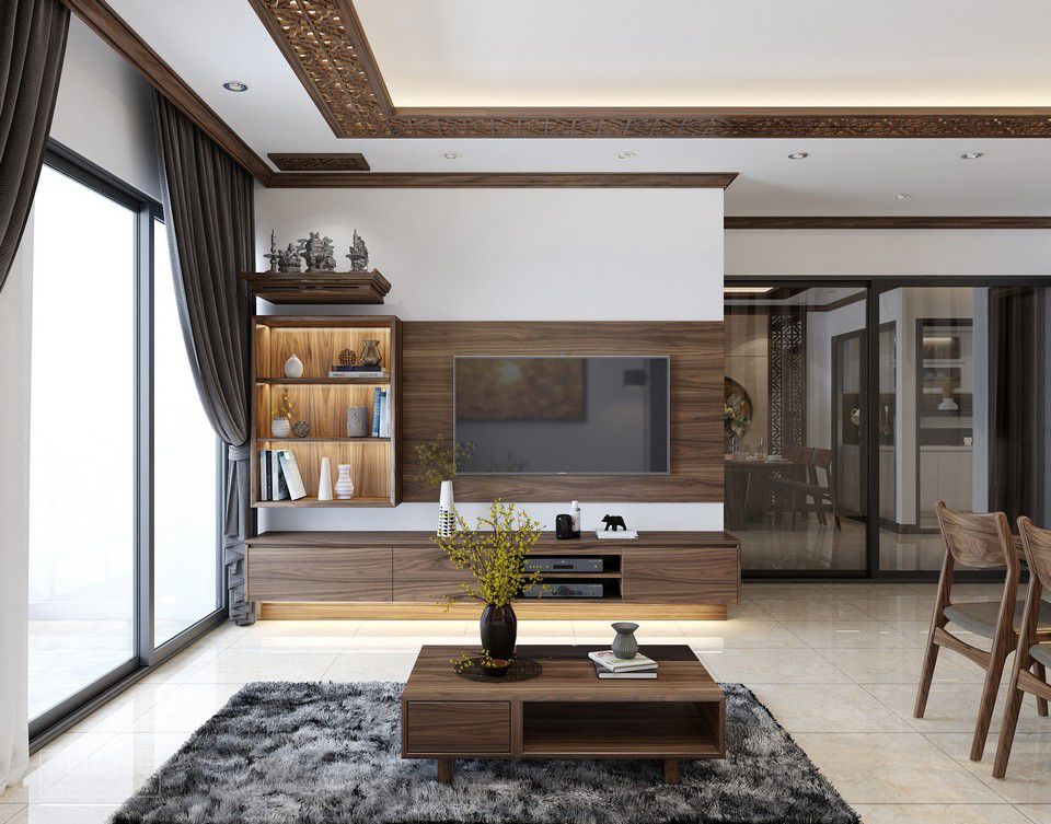Bàn trà cũng kệ tủ tivi treo tường của căn hộ cũng được thiết kế hiện đại bằng gỗ óc chó