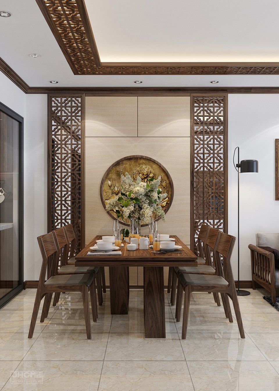 Khu vực phòng ăn bao gồm bộ bàn ăn hiện đại gỗ óc chó cùng bức tường được trang trí ấn tượng
