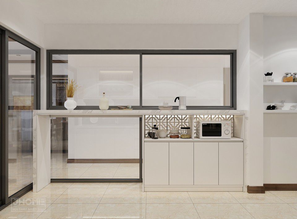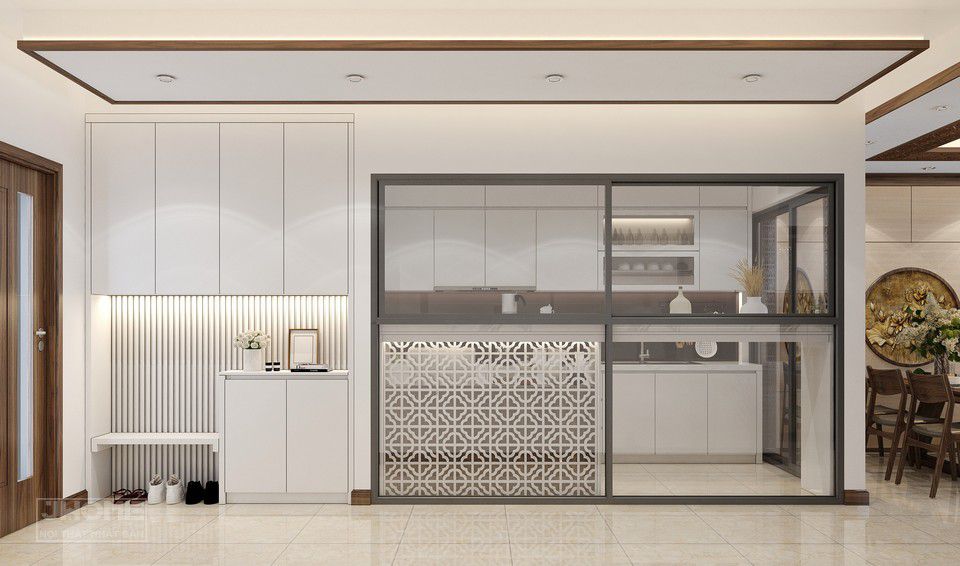 Khu vực tủ giầy và phòng bếp được thiết kế với tông màu trắng