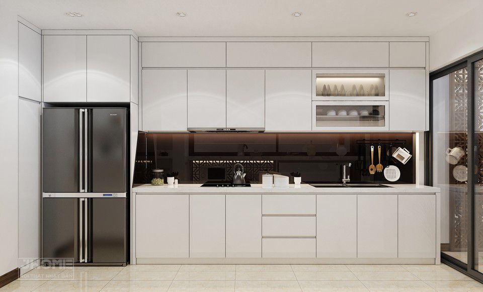 Tủ bếp chữ I với thiết kế kịch trần màu trắng đen hiện đại