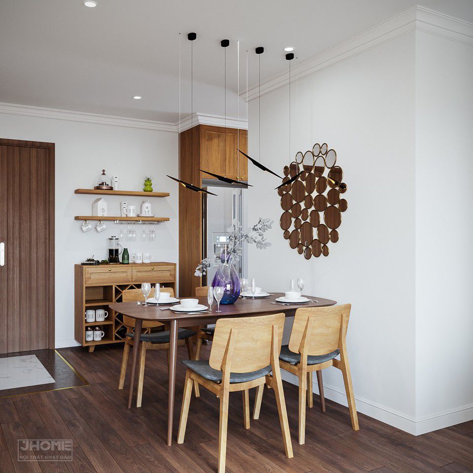 Phòng ăn với bộ bàn ăn gỗ tần bì nhỏ được trang trí với các mẫu đèn thả và tấm gương treo tường hình dáng độc đáo