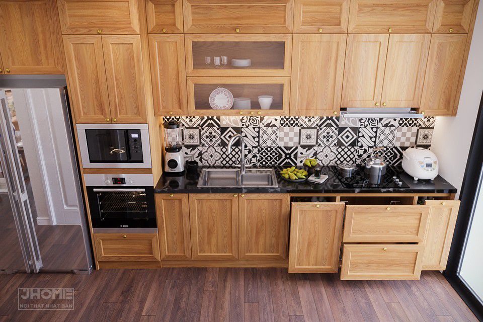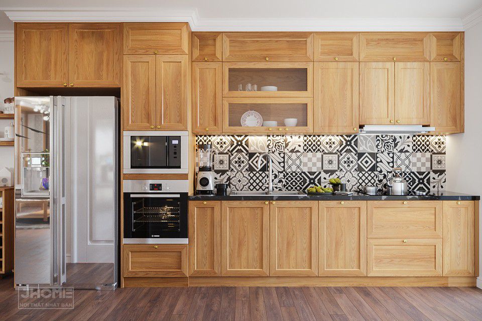 Thiết kế tủ bếp chữ I chất liệu gỗ tần bì hiện đại