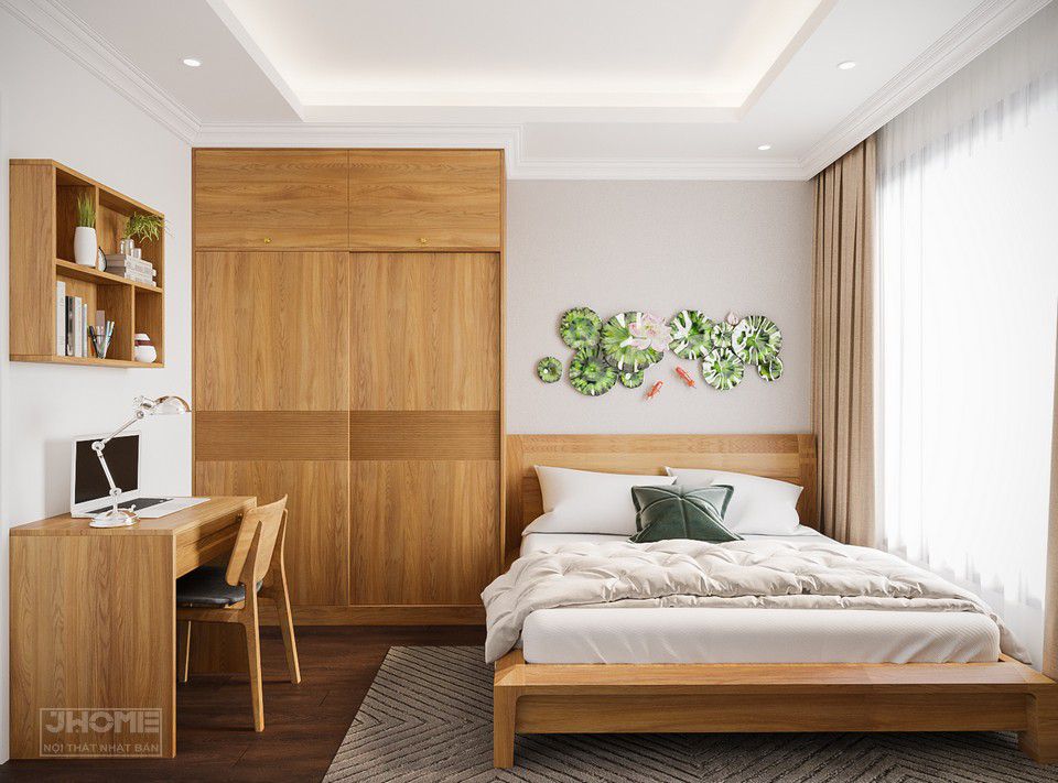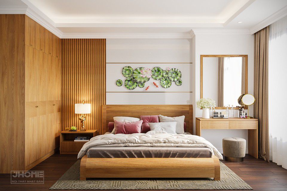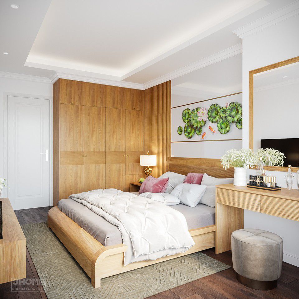 Thiết kế nội thất phòng ngủ master chất liệu gỗ tần bì kết hợp veneer tần bì hiện đại