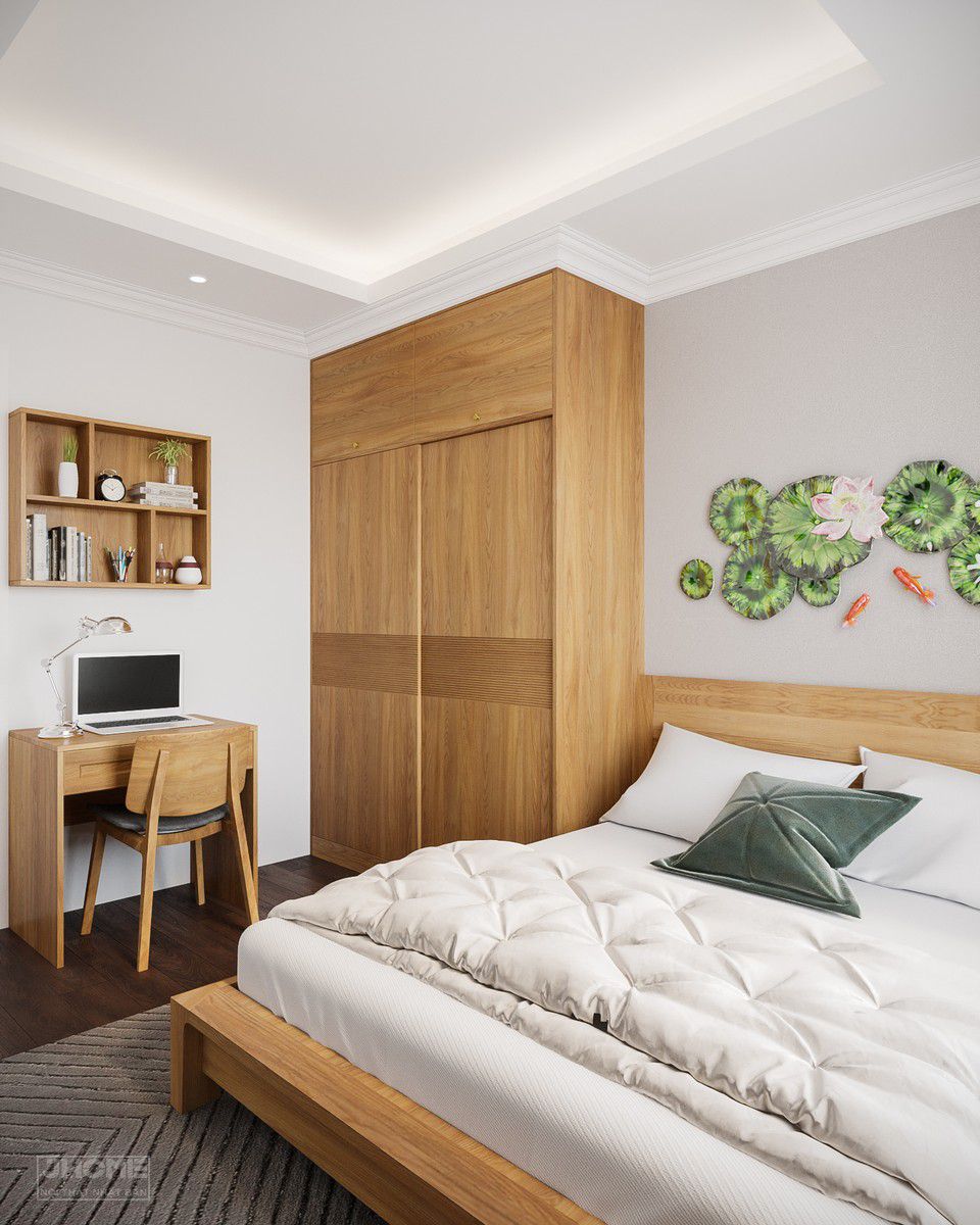 Phòng ngủ khách được thiết kế với chiếc bàn làm việc và giá sách xinh xắn