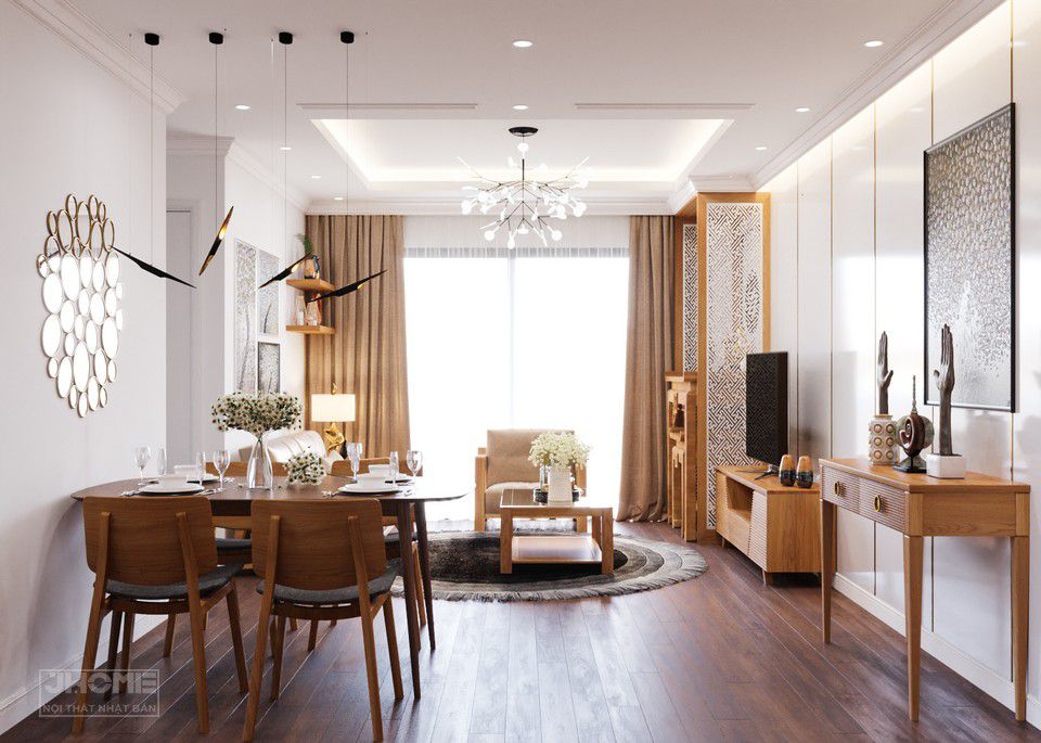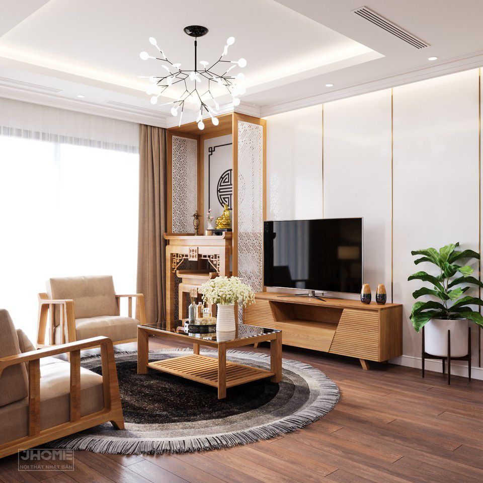Thiết kế nội thất phòng khách với bộ sofa phong cách Nhật chất liệu gỗ tần bì kết hợp đệm da màu kem đẹp mắt