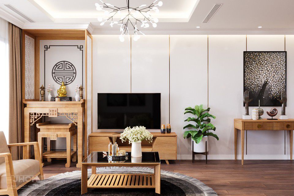Bàn thờ của căn hộ có phong cách hiện đại, đặt cạnh kệ tivi, tường phòng được trang trí với giấy dán tường họa tiết kẻ kim loại vàng đẹp mắt
