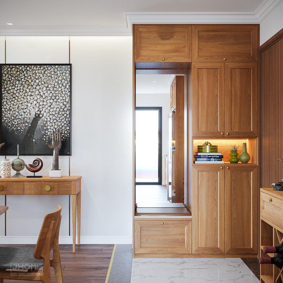 Khu vực để giấy dép lát đá hoa, tủ giầy có thiết kế hiện đại với gương soi