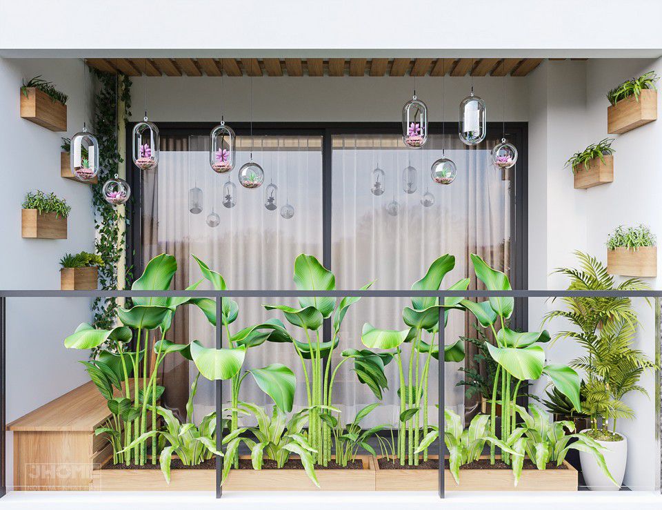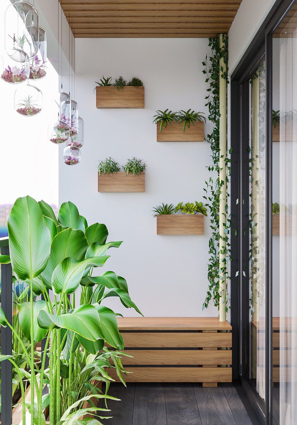 Ban công mang phong cách không gian xanh, trang trí với nhiều chậu cây gỗ treo tường và hàng cây xanh