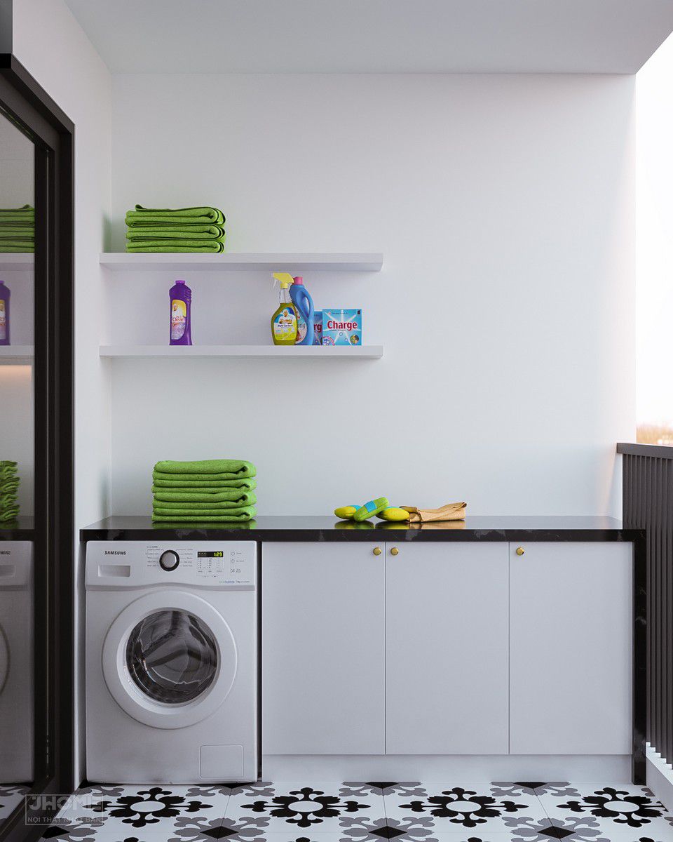 Logia là nơi để máy giặt và phơi đồ với tủ và 2 kệ nhỏ trên tường