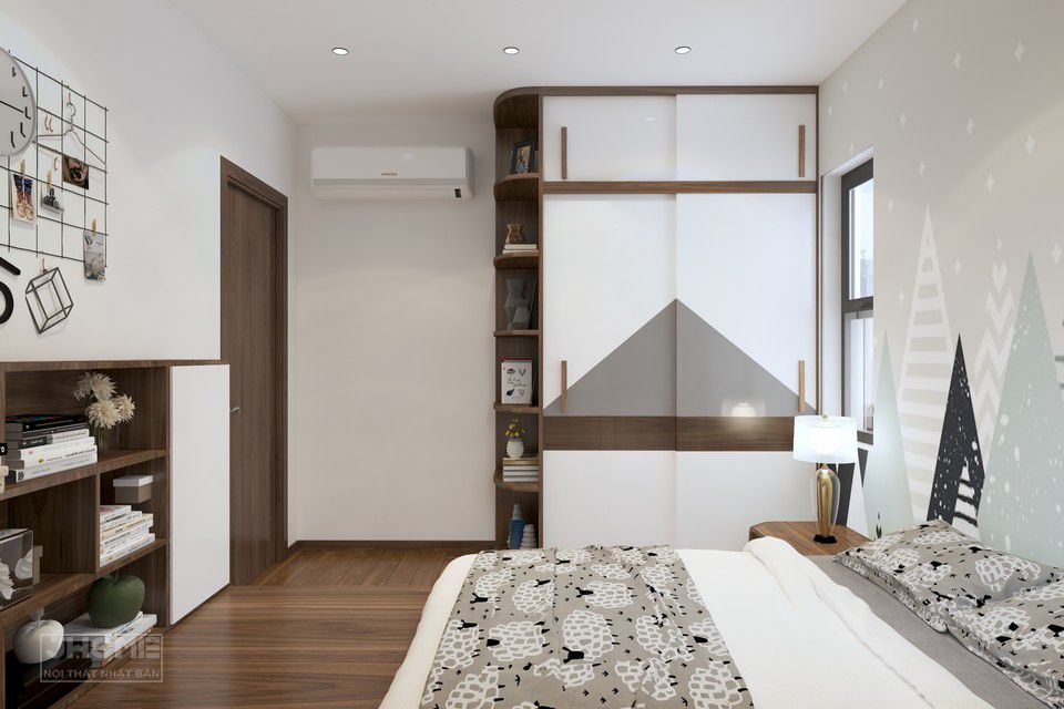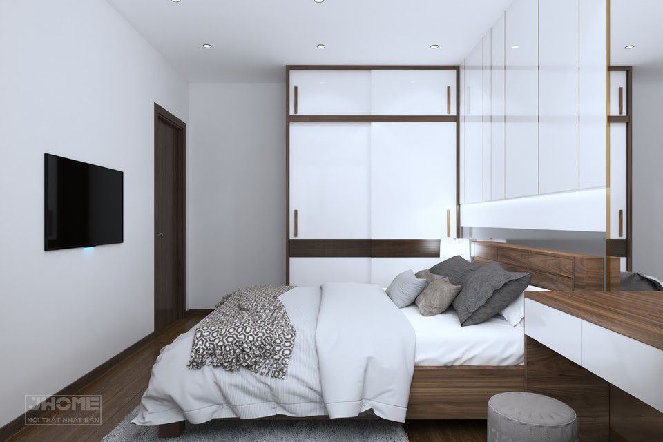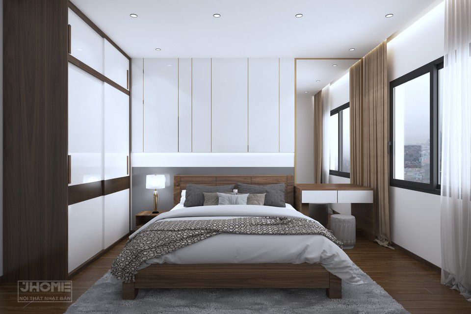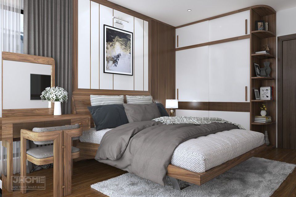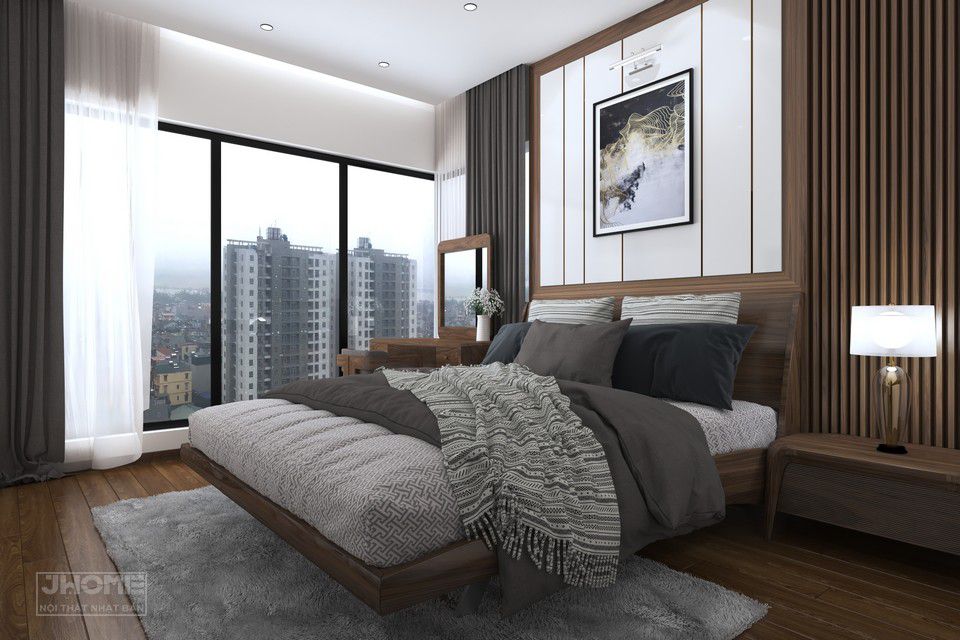 Thiết kế nội thất phòng ngủ phong cách hiện đại với chất liệu gỗ veneer óc chó chủ đạo
