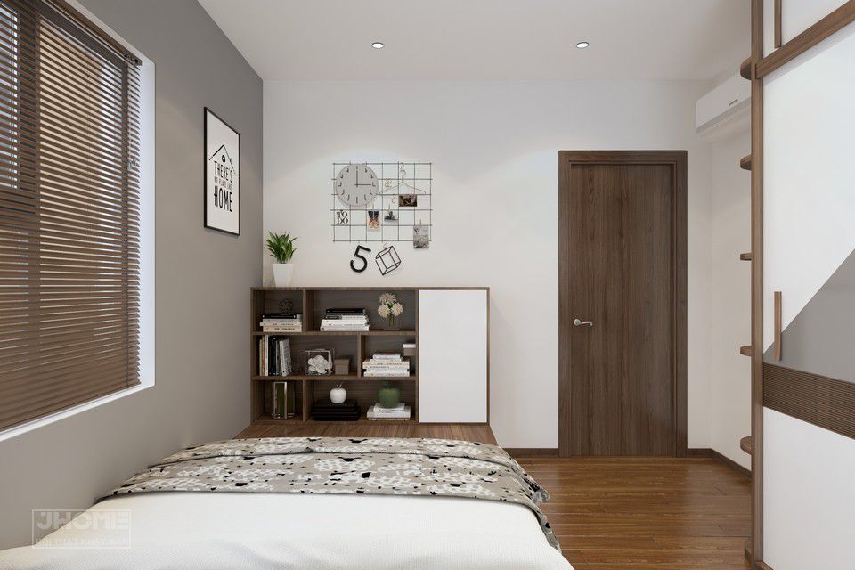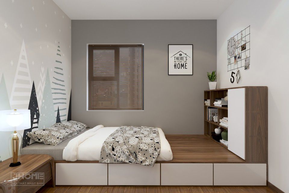 Giường phòng ngủ thiết kế dạng phản có ngăn kéo chứa đồ phía dưới, liền đó là kệ sách/kệ trang trí