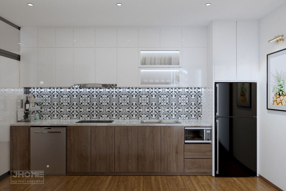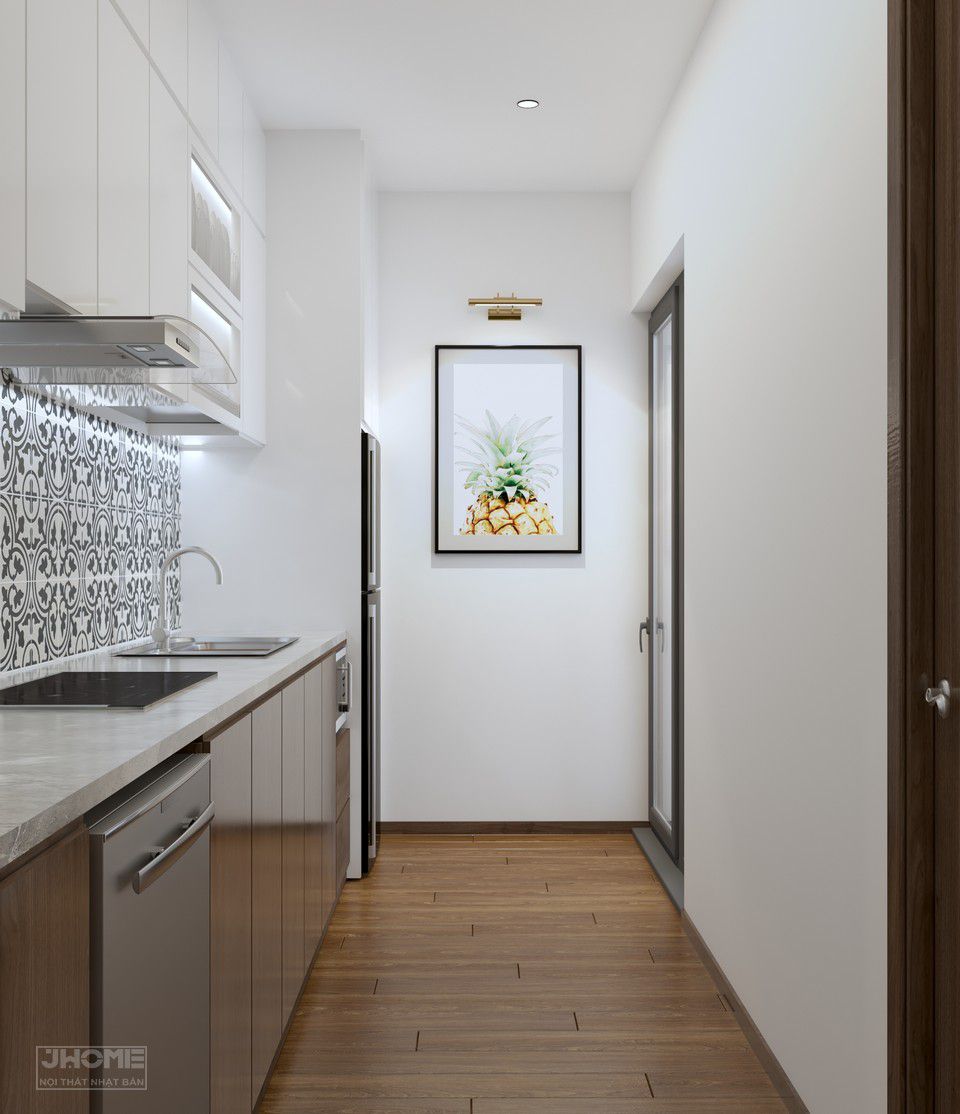 Thiết kế nội thất phòng bếp với tủ bếp chữ I thiết kế kịch trần chất liệu veneer óc chó ở tủ bếp dưới và gỗ MDF sơn trắng ở tủ bếp trên