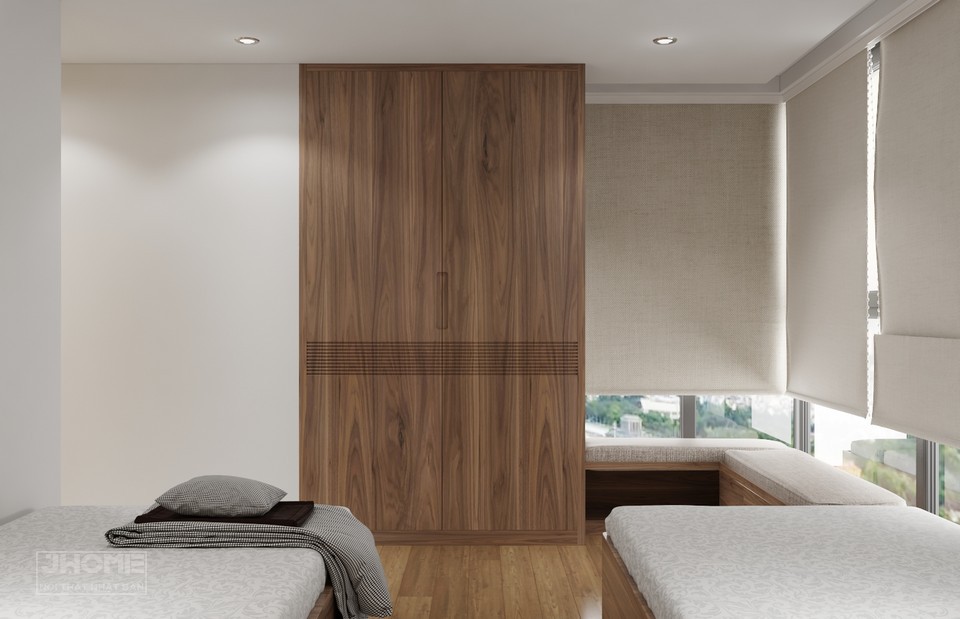 Cạnh đó là chiếc tủ quần áo kịch trần với 2 cánh bằng gỗ veneer sồi sơn giả óc chó