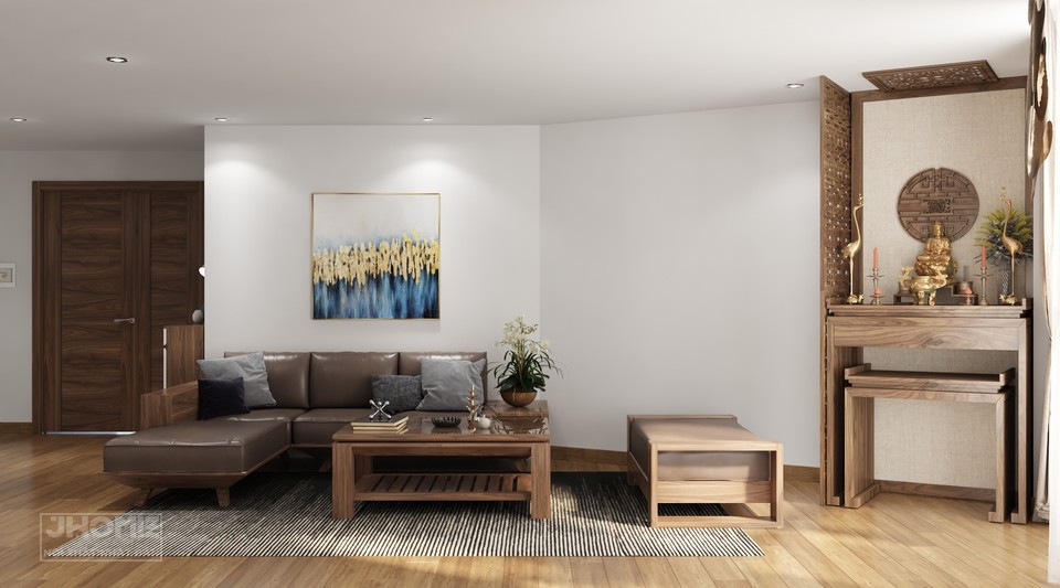 Bàn thờ hiện đại đặt cạnh bộ sofa gỗ sồi sơn màu nâu