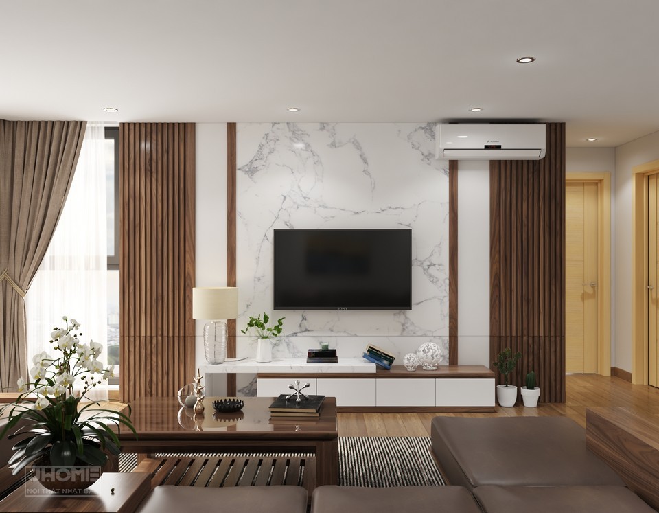 Kệ tivi sơn cánh trắng kết hợp mặt đá và bức tường trang trí sang trọng