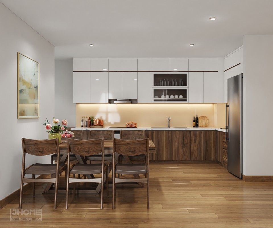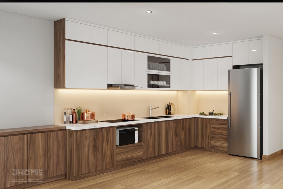 Tủ bếp chữ L bằng chất liệu gỗ sồi sơn giả óc chó, tủ bếp trên sơn cánh trắng