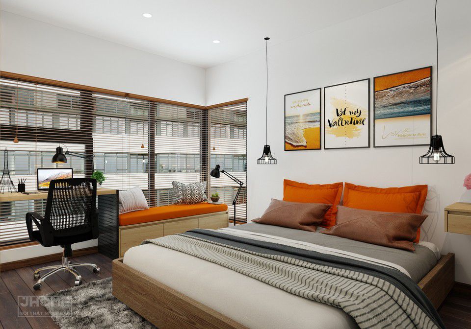 Phòng ngủ có những điểm nhấn màu cam ấn tượng cùng hệ cửa sổ rộng lớn