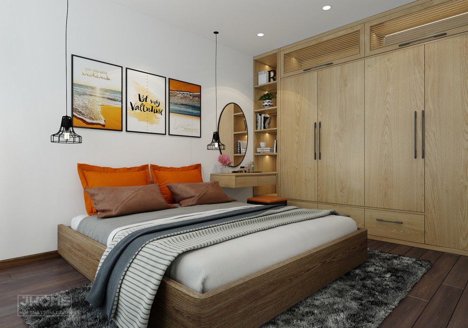 Chiếc tủ quần áo thiết kế kịch trần và bàn trang điểm treo thiết kế hiện đại làm từ chất liệu veneer sồi