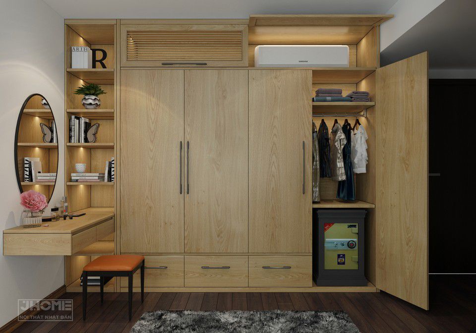 Phía bên trái là hệ tủ quần áo với 4 ngăn mặt ngoài