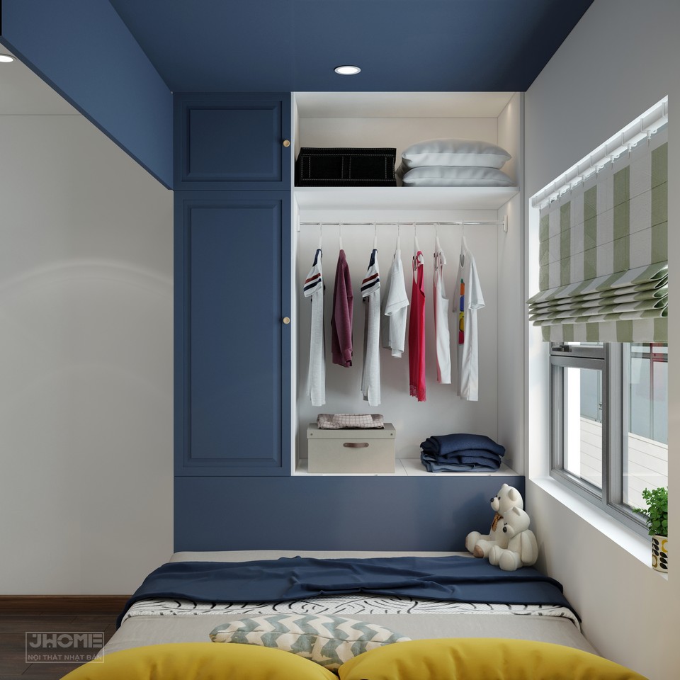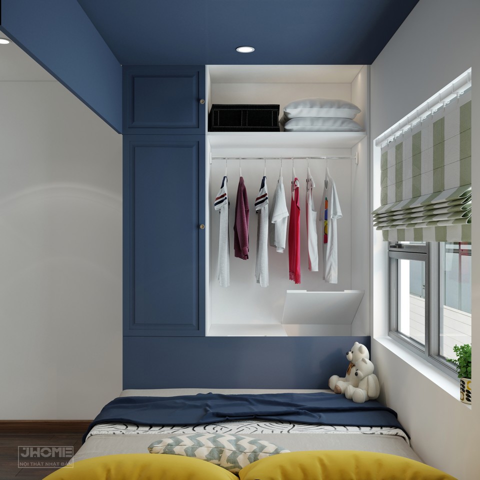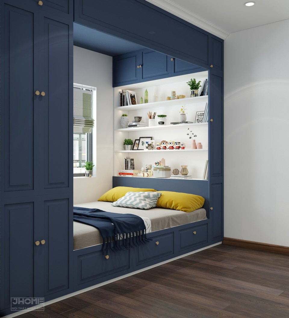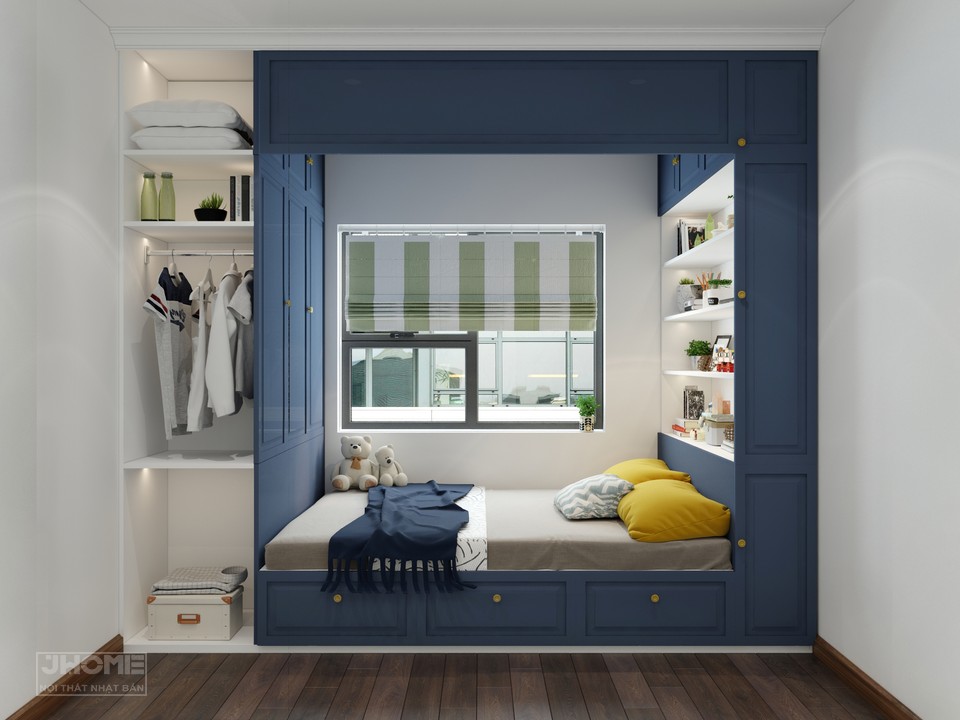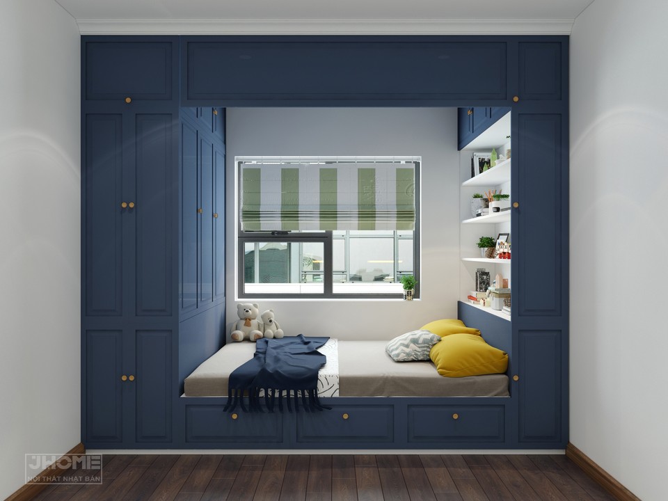 Phòng ngủ con trai được thiết kế tạo thành một khối hộp ấn tượng với chất liệu gỗ công nghiệp sơn màu xanh