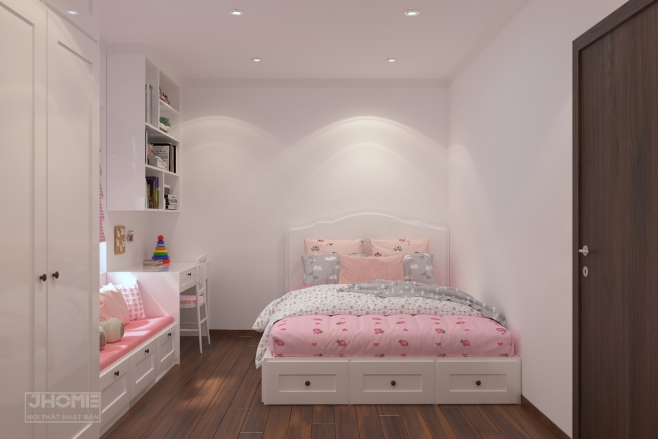 Phòng ngủ con gái thiết kế tông màu trắng hồng nữ tính