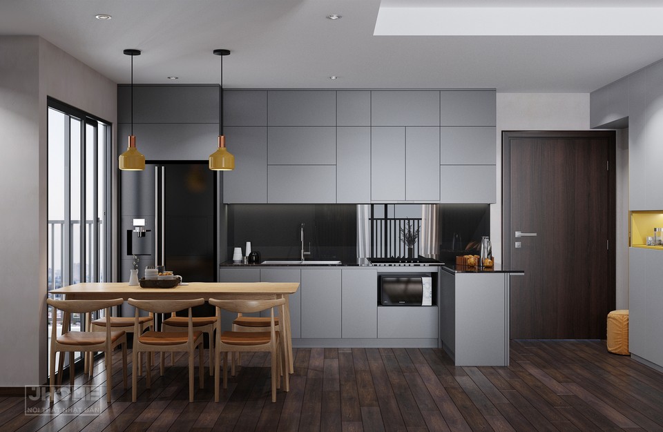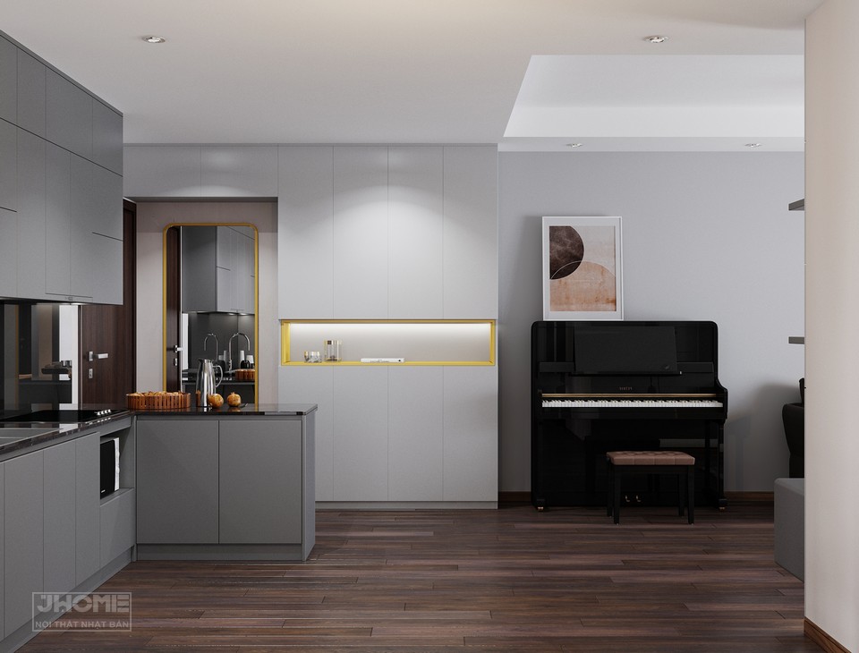 Tủ bếp thiết kế kịch trần chất liệu MDF chống ẩm sơn mài xám, đá ốp bếp màu đen bóng sang trọng