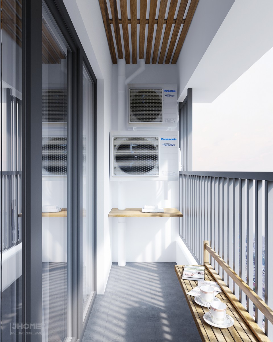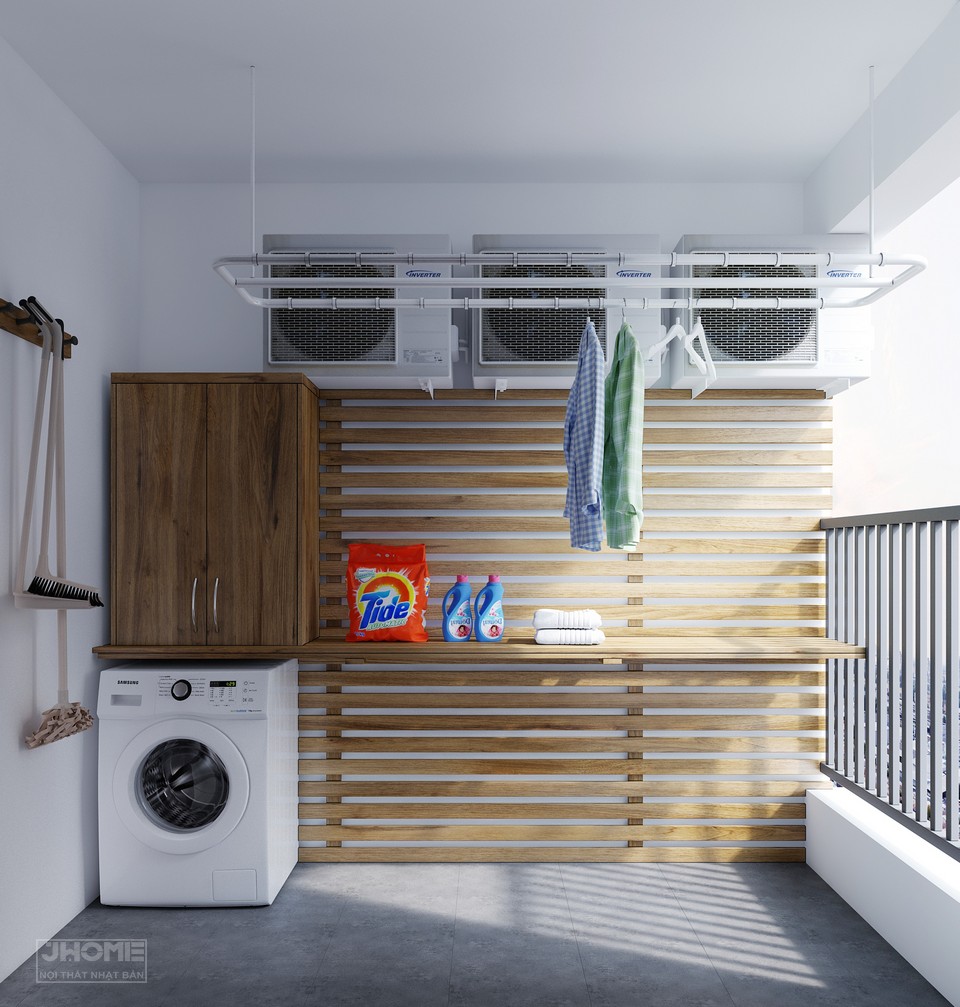 Logia là nơi phơi đồ được trang trí với các thanh gỗ ngang, kệ ngang và tủ chứa đồ
