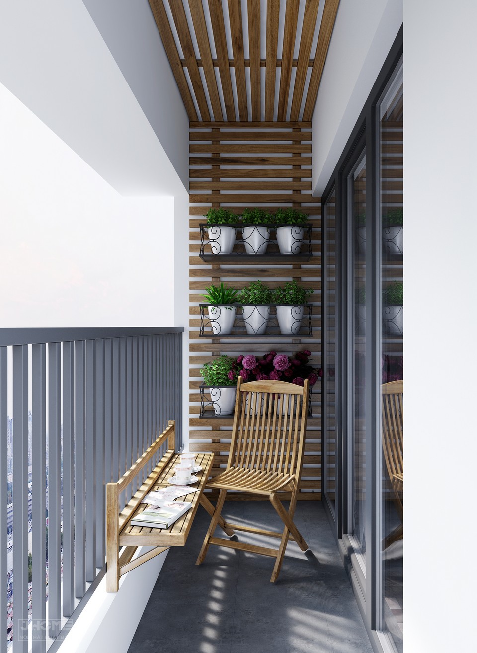 Ban công được thiết kế thành một khu vực độc sách ngoài trời thú vị có bàn, ghế, trên tường là các kệ trưng bày hoa, cây xanh…