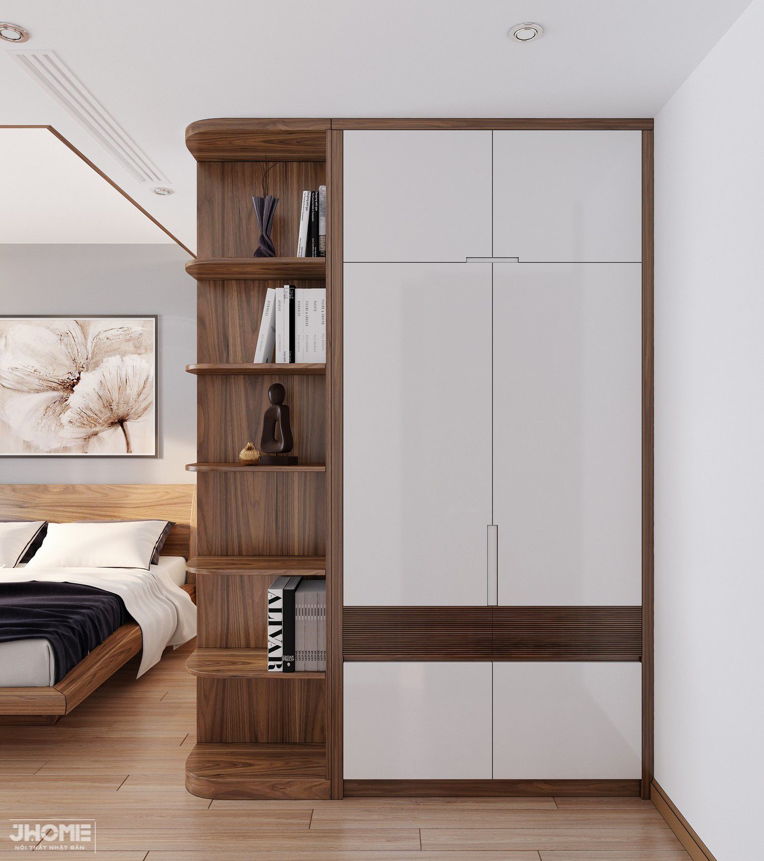 Tủ quần áo có thiết kế kịch trần hình chữ L với các ngăn được bố trí khoa học, tiện lợi