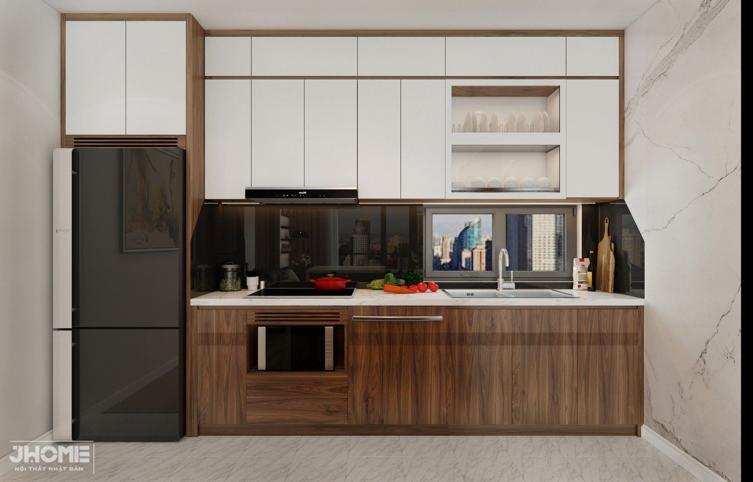 Tủ bếp thiết kế kịch trần với tủ bếp dưới gỗ óc chó, tủ bếp trên veneer óc chó sơn trắng