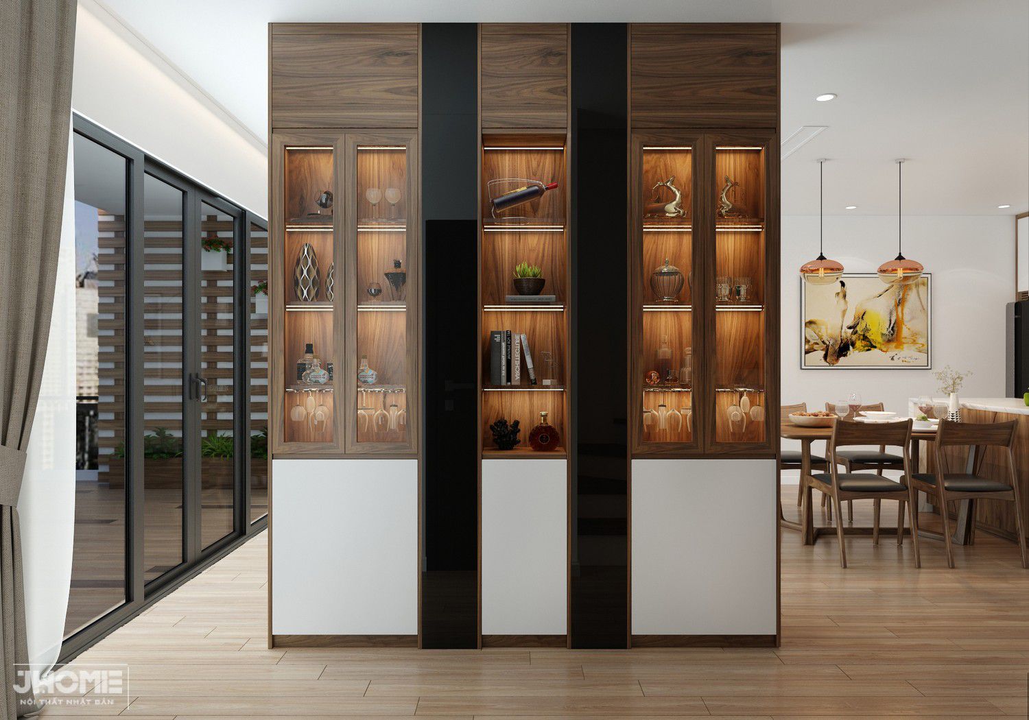 Mặt sau kệ tivi là tủ rượu với thiết kế đẹp mắt, sang trọng
